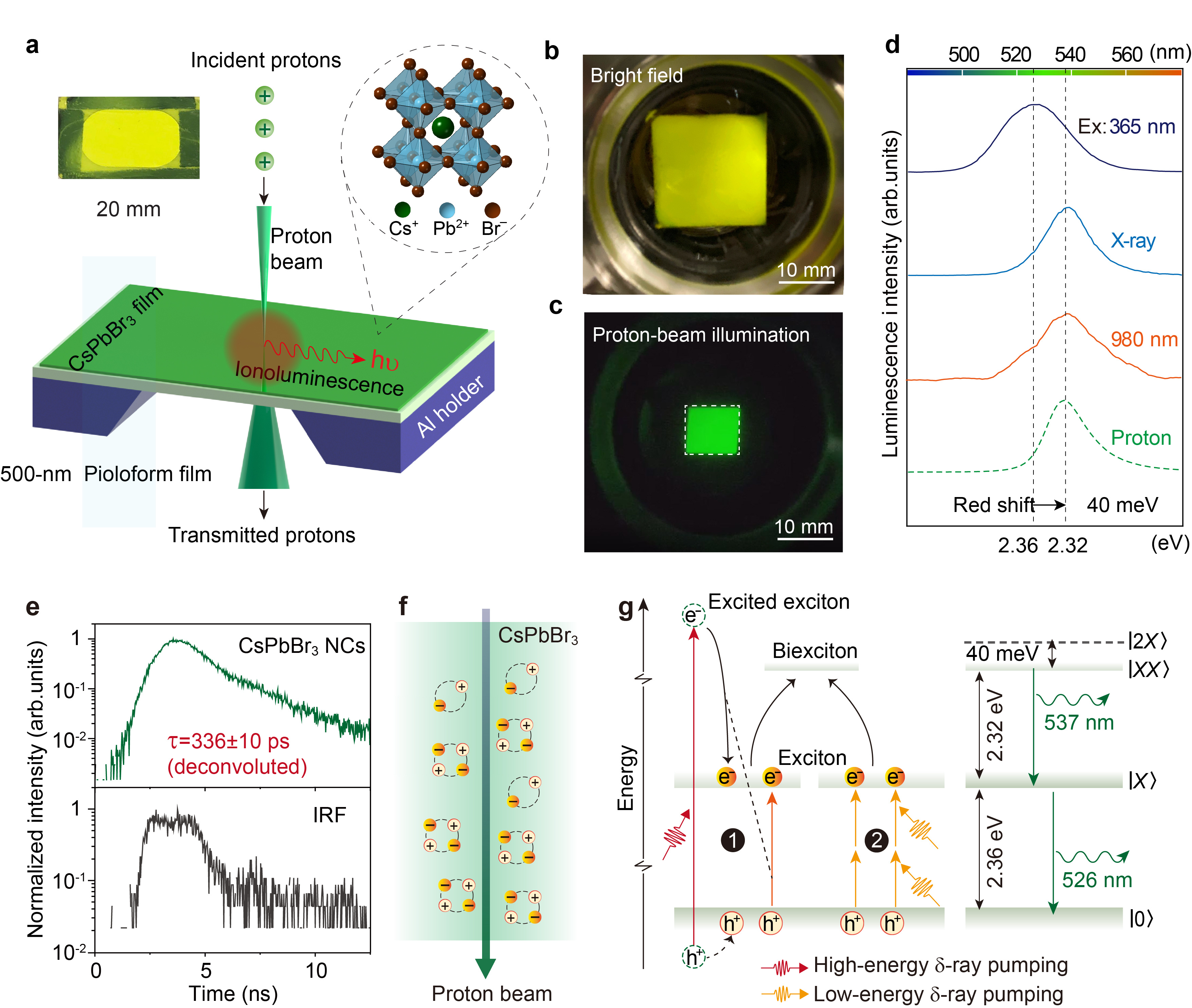 Proton-induced luminescence from CsPbBr3 nanocrystal scintillators. a, Schematic of proton-beam-induced luminescence (ionoluminescence) in a thin transmission scintillator comprising CsPbBr3 nanocrystals. b-c, Experimental demonstration of proton-induced scintillation from a CsPbBr3 nanocrystal scintillator. (b, bright-field imaging of the scintillator; c, proton-beam illumination within the square marked in b) d, Luminescence emission spectra of CsPbBr3 nanocrystals under excitation with a 365-nm light source, 40-keV X-rays (99 μA), a 980-nm laser, and 2-MeV protons, respectively. e, Time-resolved ionoluminescence measurement. f, Schematic of biexcitons as four-body quasiparticles. g, Proposed mechanism of proton scintillation in a CsPbBr3 nanocrystal.
