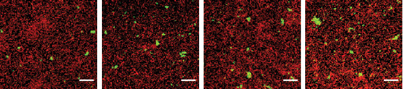 Increasing amounts of exogenous pABA (from left to right) enhance P. gingivalis (green) community formation with S. gordonii (red)