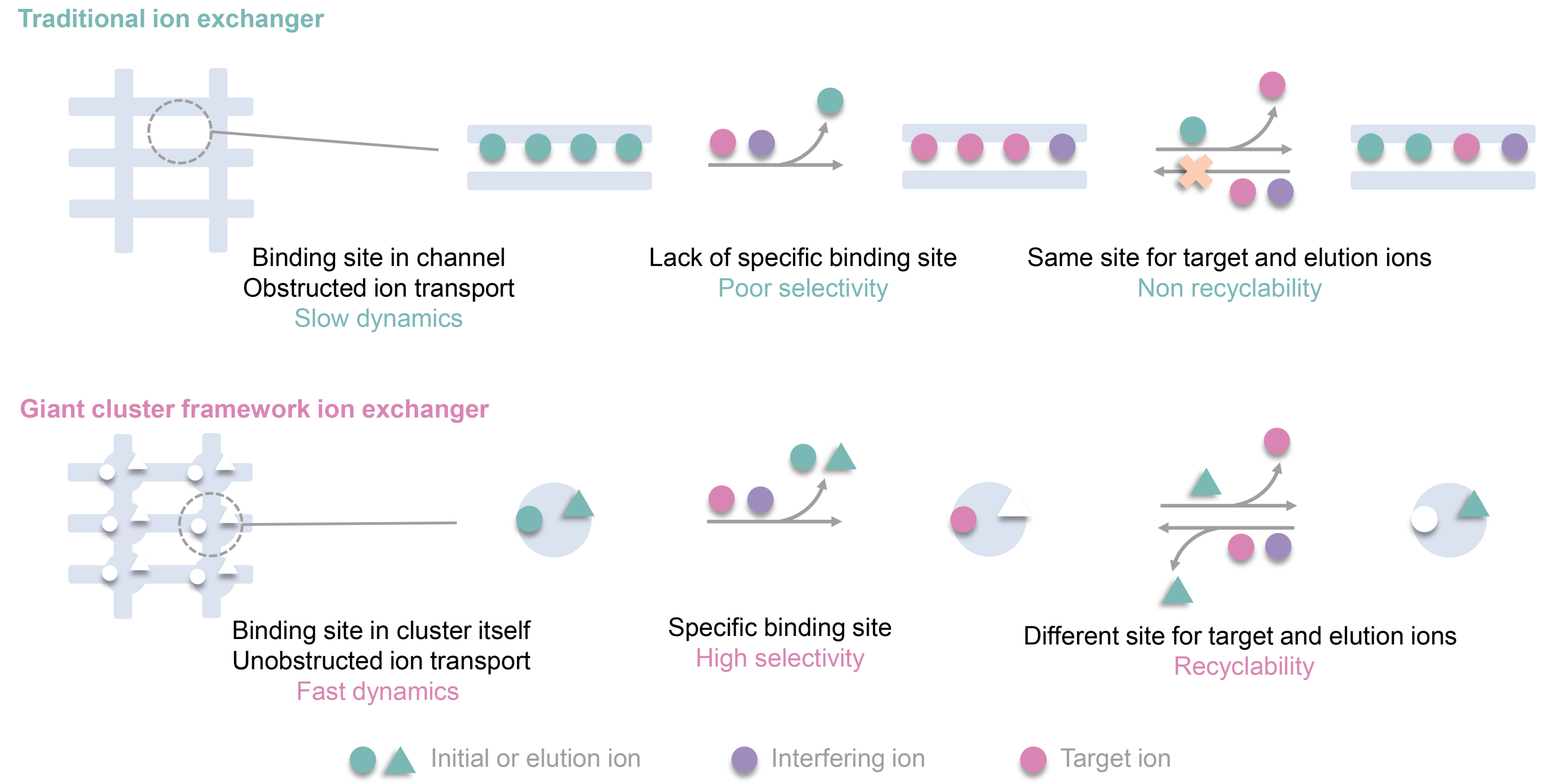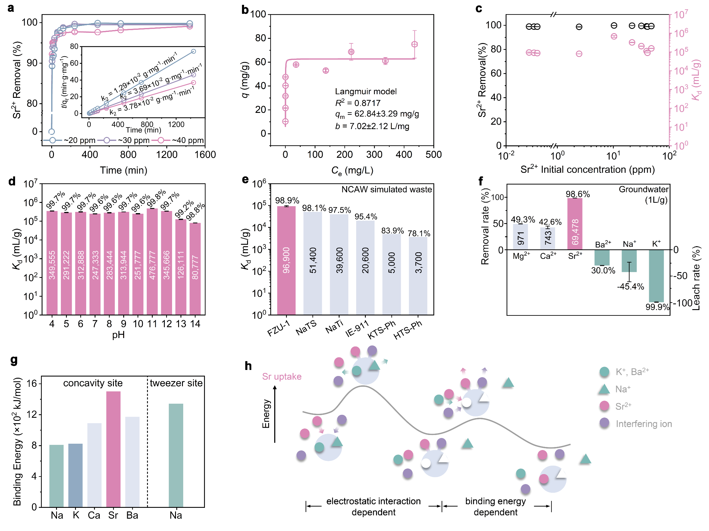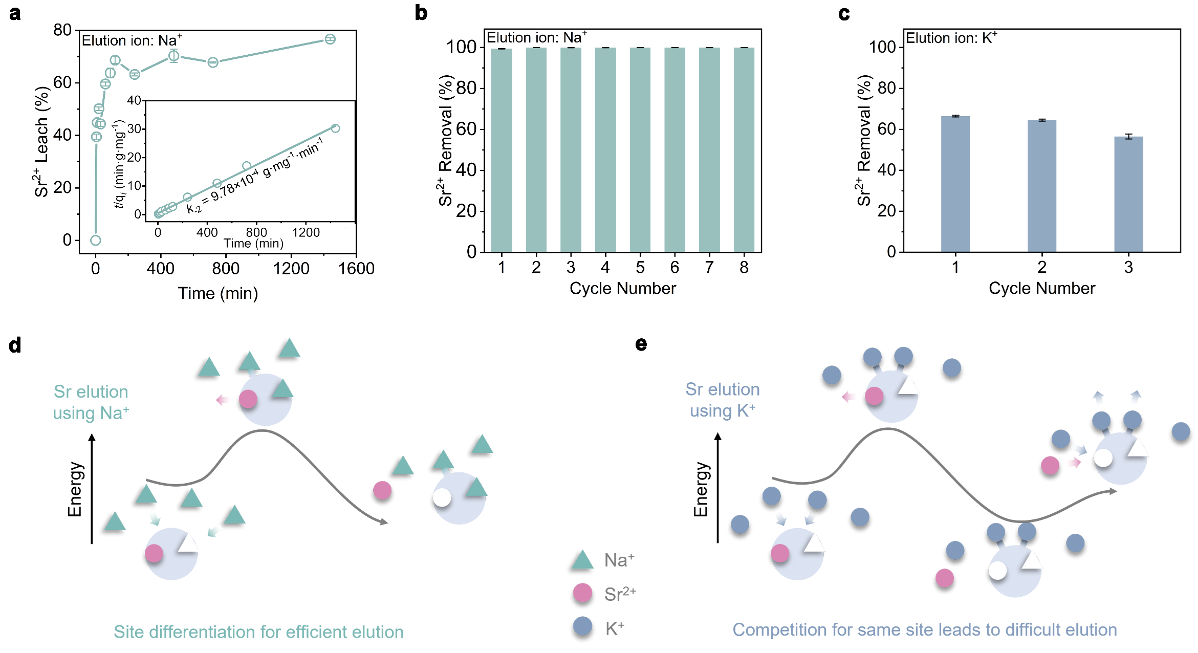 Propose a novel site differentiation strategy for Sr2+ uptake and elution. High selectivity and convenient elution are often contradictory. High selectivity means that the effective cavity diameter and chemical environment of the exchange active site will accommodate the target ions well, which makes it difficult for the captured ions to escape from this stable chemical environment. Generally, elution ions must overcome high binding energy to exchange target ions and replace the binding site, which is extremely challenging. Here, we propose a site differentiation strategy, that a Sr2+ adsorbent possesses two distinct ion adsorption sites, capable of selectively capturing target Sr ions and elution ions, respectively, it not only has the potential to efficiently adsorb Sr ions through the Sr2+ sites, but also can achieve efficient elution of Sr ions by loading elution ions onto the elution ion sites during the elution process, based on charge balance. It avoids the challenge faced by conventional Sr adsorbents where elution ions need to directly compete with Sr2+ ions for adsorption sites during elution.