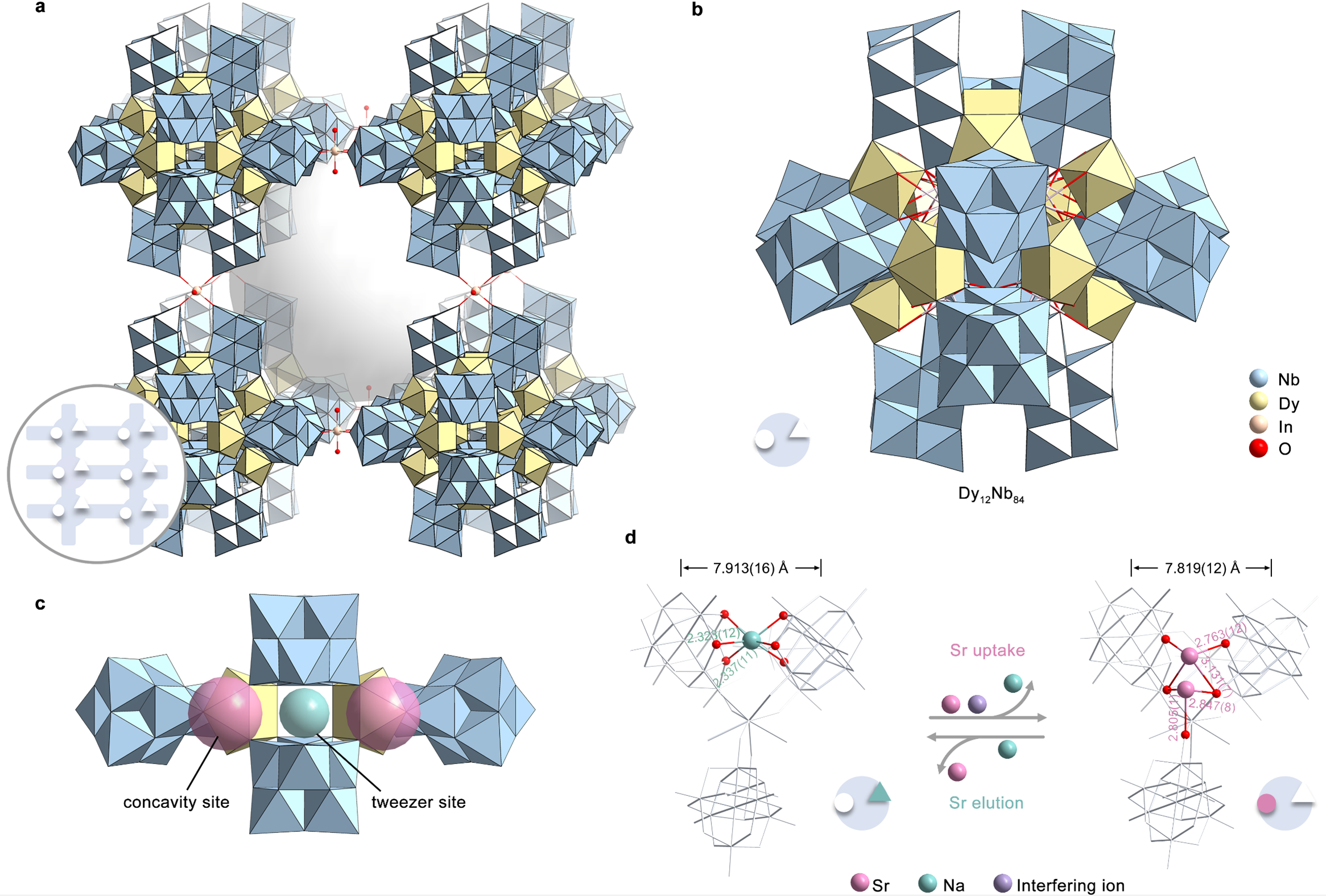 Demonstrate validity and reliability of the site differentiation strategy: an all-inorganic polyoxomolybdate (PONb) as a proof-of-concept model. Based on the concept of the site differentiation strategy, an all-inorganic giant PONb-based three-dimensional (3D) framework material (FZU-1) with the presence of distinct selective metal capture sites (concavity site and tweezer site) acts as a proof-of-concept ion exchanger. FZU-1 can not only effectively remove 98.9% of Sr²⁺ from simulated nuclear liquid waste, performing best among the reported Sr adsorbents, but also achieve desorption of adsorbed Sr²⁺ ions by selectively loading Na⁺ ions, thus enabling the recycling of FZU-1. Besides nuclear waste, FZU-1 can also be effectively used as a trace Sr²+ remover for ground-water remediation, capable of removing 98.6% of Sr²⁺ in a simulated groundwater with ppb level Sr²⁺ ions, performing nearly as effectively as excellent inorganic adsorbents. The exceptional stability of FZU-1, along with selective Sr²⁺ capture and elution capabilities, positions it as a promising candidate for large-scale nuclear waste treatment and groundwater remediation applications.