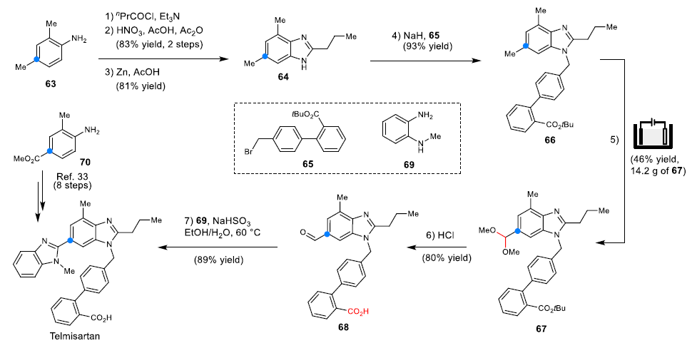The synthetic utility of our electrochemical protocol is further demonstrated by the total synthesis of antihypertensive drug telmisartan. It's worth mentioning that, our synthetic route starting from commercially available material 2,4-dimethylaniline 63 are much cheaper than ester 70 used in a previously published 8-step method.
