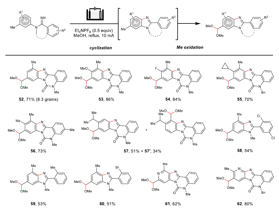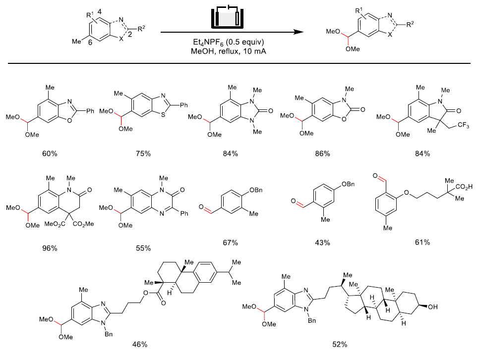 We began our study by first optimizing the electrooxidation of benzimidazole bearing Me groups at positions 4 and 6, we found that under optimized condition the single oxidation at C6-Me group product was achieved without overoxidation to orthoester, besides other potentially labile substituents such as C4-Me, N–Bn, or 3° C–H on the cyclohexyl moiety was untouched.