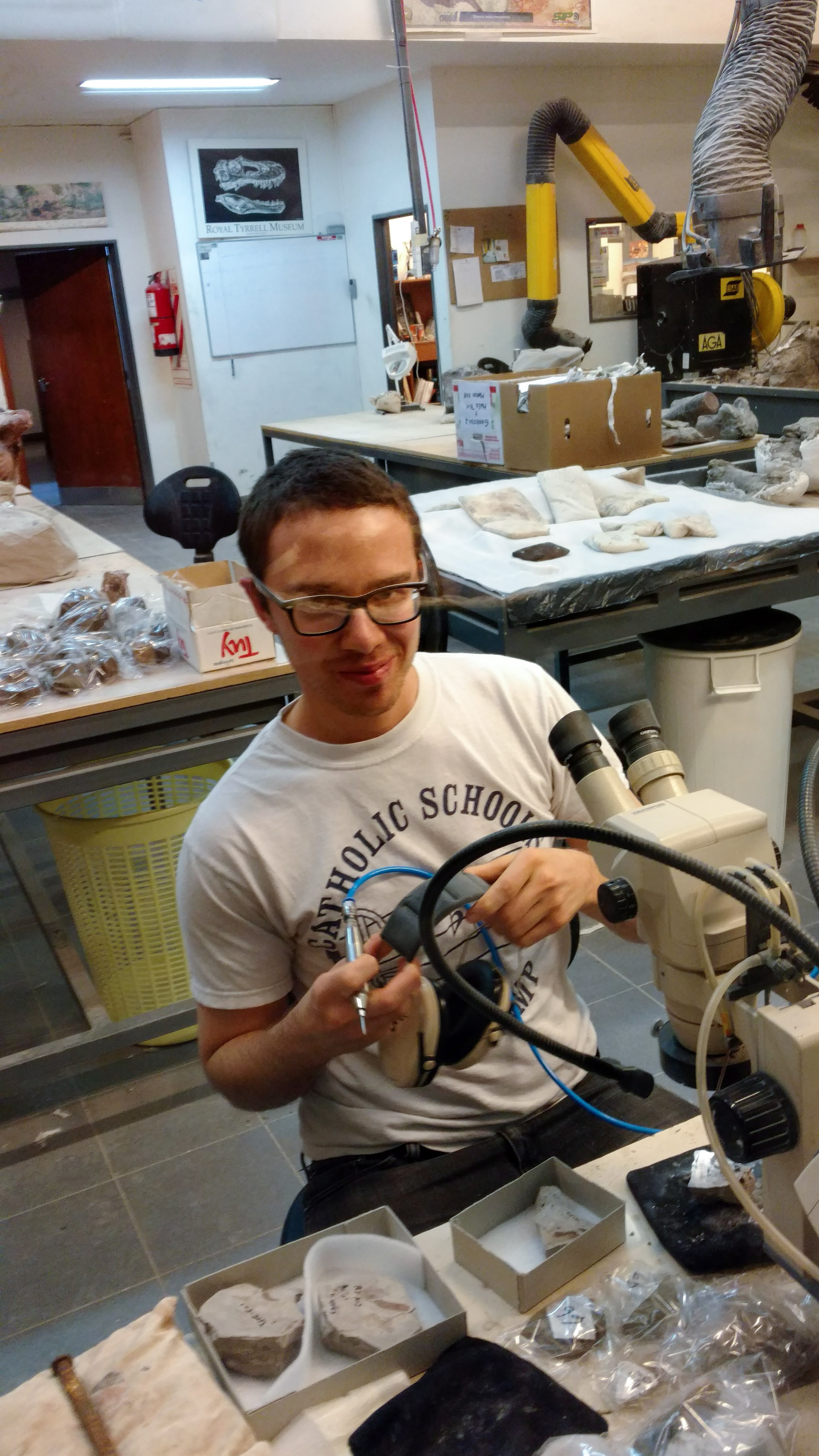 Figure 3. Preparing Agathis fossils in the lab at the Museo Paleontológico Egidio Feruglio, Trelew, Argentina. (Photo credit: Peter Wilf)