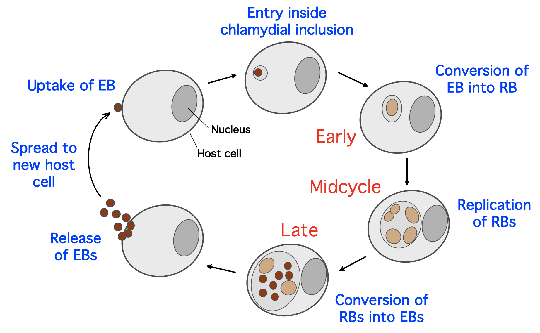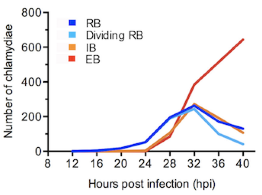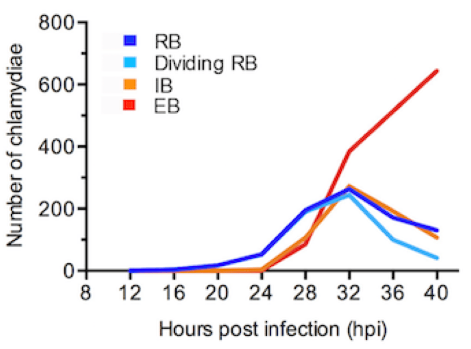 Let’s start at the very beginning with how this bacterium multiplies – chlamydial reproduction is complicated compared to its prokaryotic cousins because it only occurs inside an infected host cell, and involves conversion between two developmental forms of the organism. The reticulate body (RB), which is the vegetative form, divides repeatedly before converting into the infectious, environmentally-stable elementary body (EB). Conventional depiction of this developmental cycle shows a Chlamydia-infected cell at different steps in the intracellular infection: