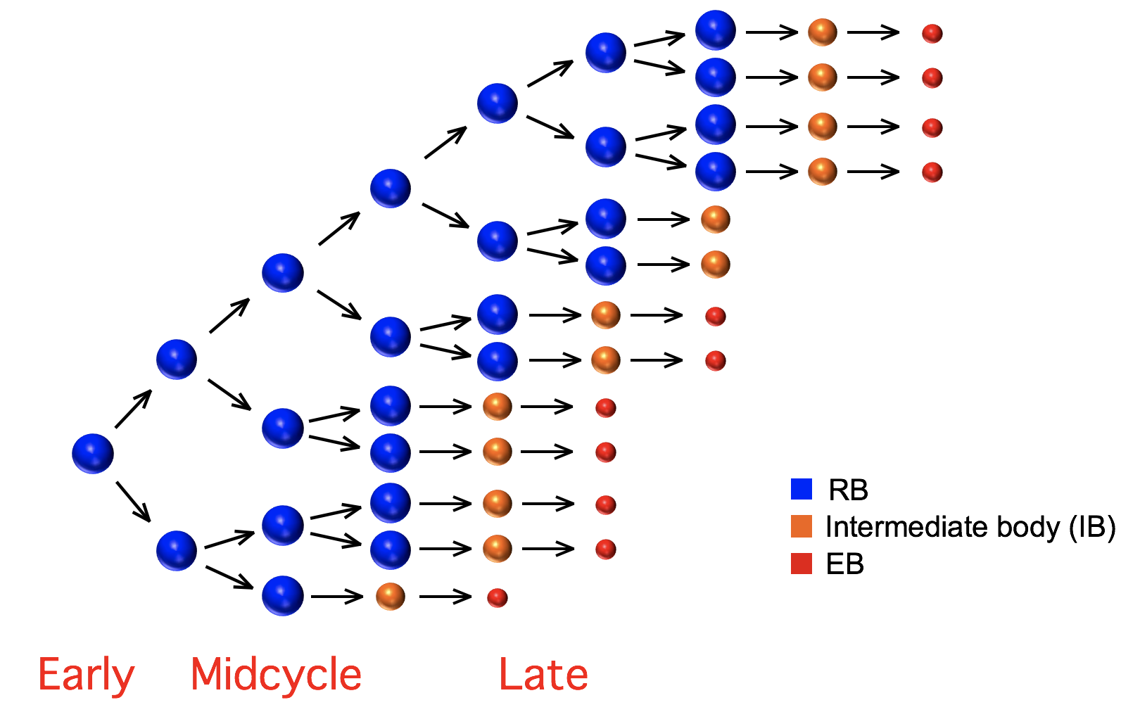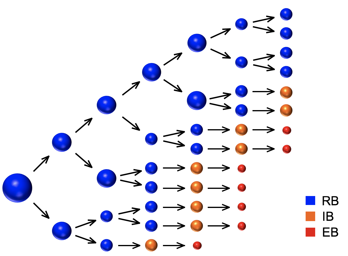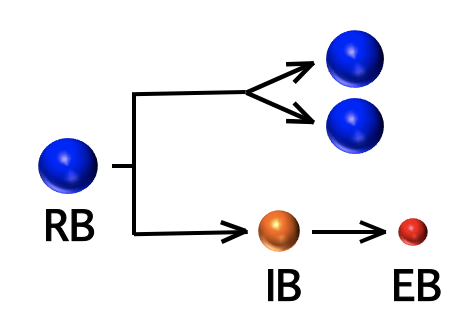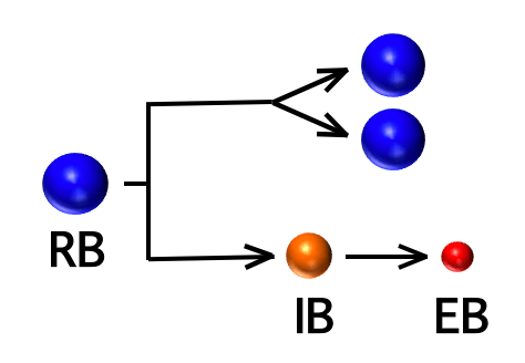 An RB can either replicate or convert into an EB. The IB (intermediate body) is a conversion intermediate.