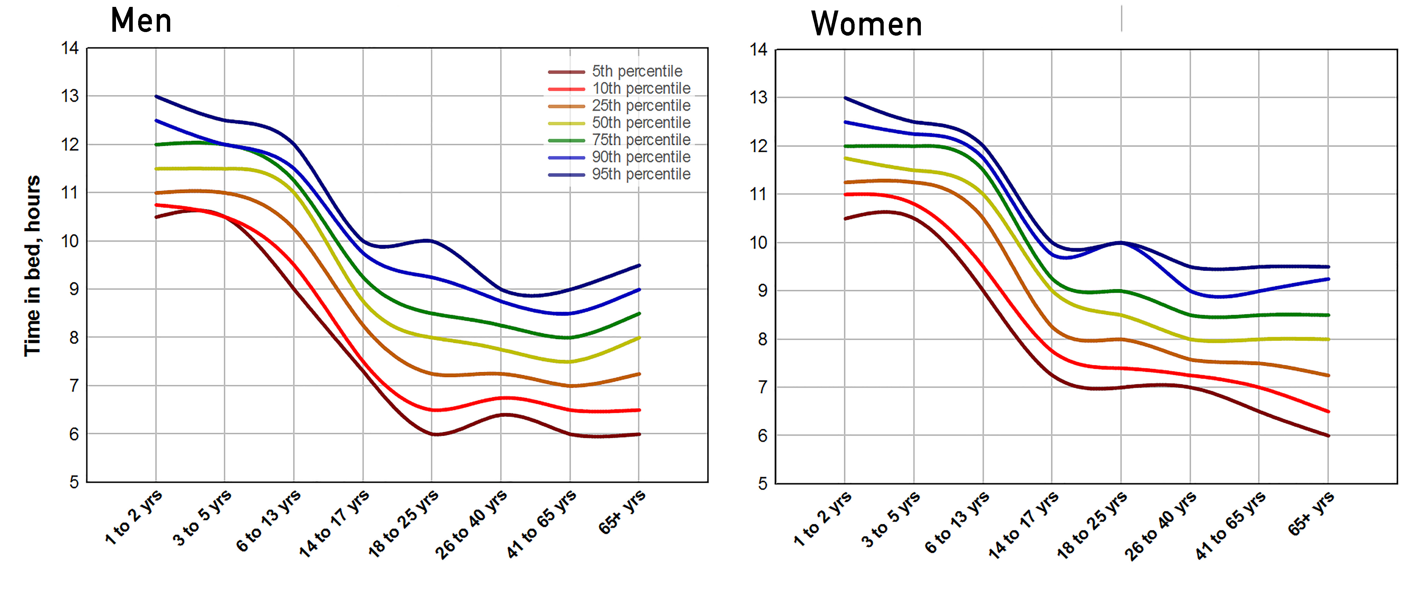 We found that merely 6% of the Dutch adult population sleeps less than the “acceptable” 6 hours, but this increases to 25% in middle-aged and elderly persons. More than half of teenagers, however, sleep nearly an hour less than the recommended 8-10 hours for this age group. From this detailed dataset we derived specific reference charts for sleep duration and efficiency across the lifespan, and showed the variation in time in bed for men and women. We expect these charts can be useful in primary care. Instead of recommending an elusive goal of a certain number of hours sleep, practitioners can compare individual’s sleep habits with the average population of that age, and give individually tailored advice. For example, if a 45-year-old woman spends 6.5 hours in bed, this is shorter than 95% of the female population of similar age. A man of the same age and time spent in bed, spends less time in bed than 90% of the male population of similar age. Having learnt from our data that adults that spend between 7-8 hours in bed have most optimal sleep quality and the least insomnia-like problems, this may be a straight-forward way to advice on adequate sleep.