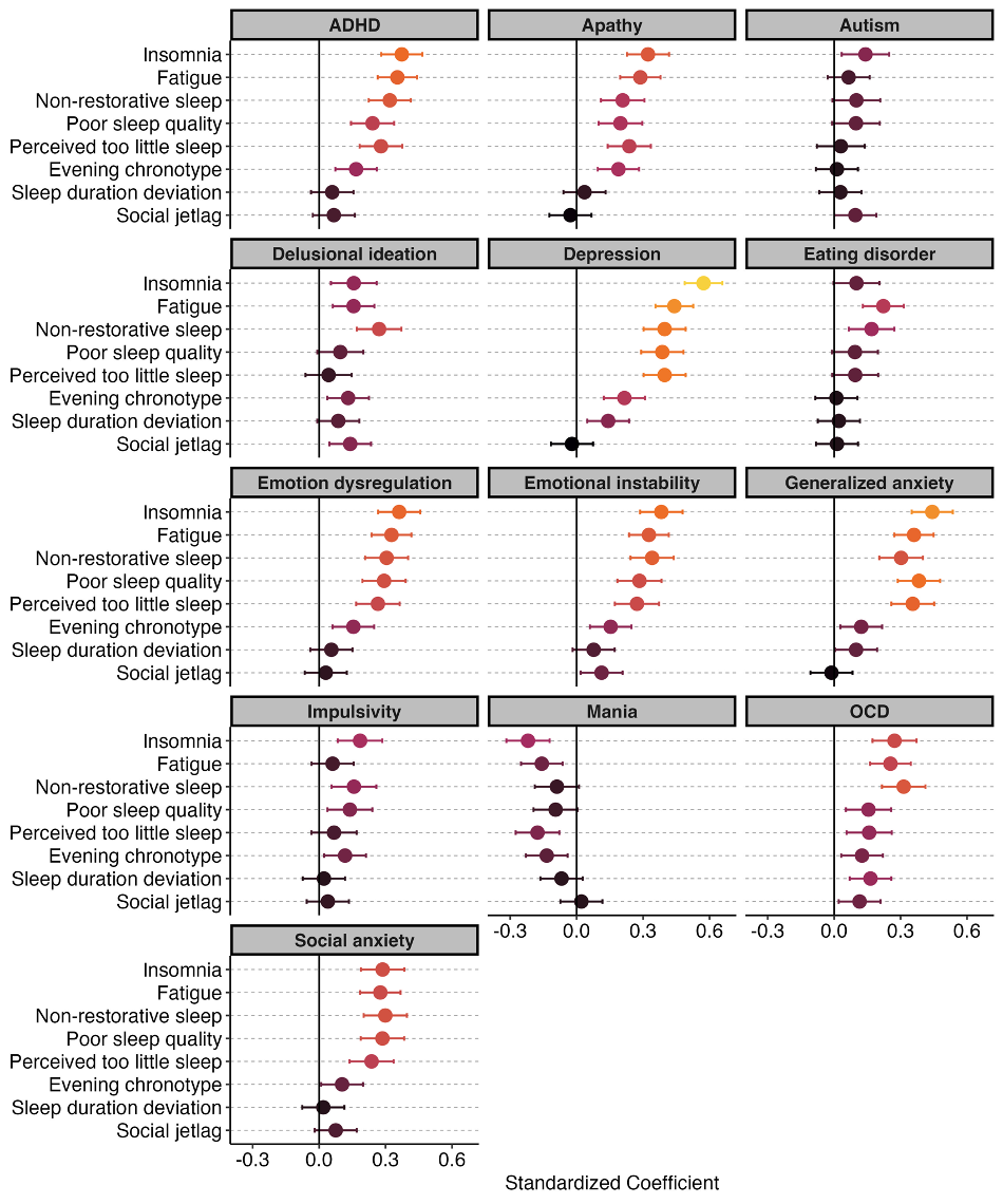 Figure 1. These plots depict the sleep features associated with each psychiatric trait. A coefficient of 0 indicates no relationship. Lighter color intensities signify a stronger association. A higher sleep duration deviation indicates a deviation from the mean sleep duration of 7h39min (either shorter or longer sleep than the mean). Error bars represent 95% confidence intervals; if they touch zero, it indicates a non-significant relationship.
