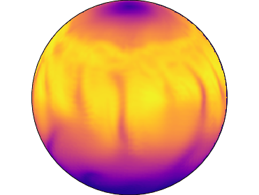 Temperatures at surface of neutron star with 90% of energy stored in toroidal magnetic field at age 24 thousand years. The poloidal magnetic field is inclined by 45 degrees in respect to the toroidal magnetic field.