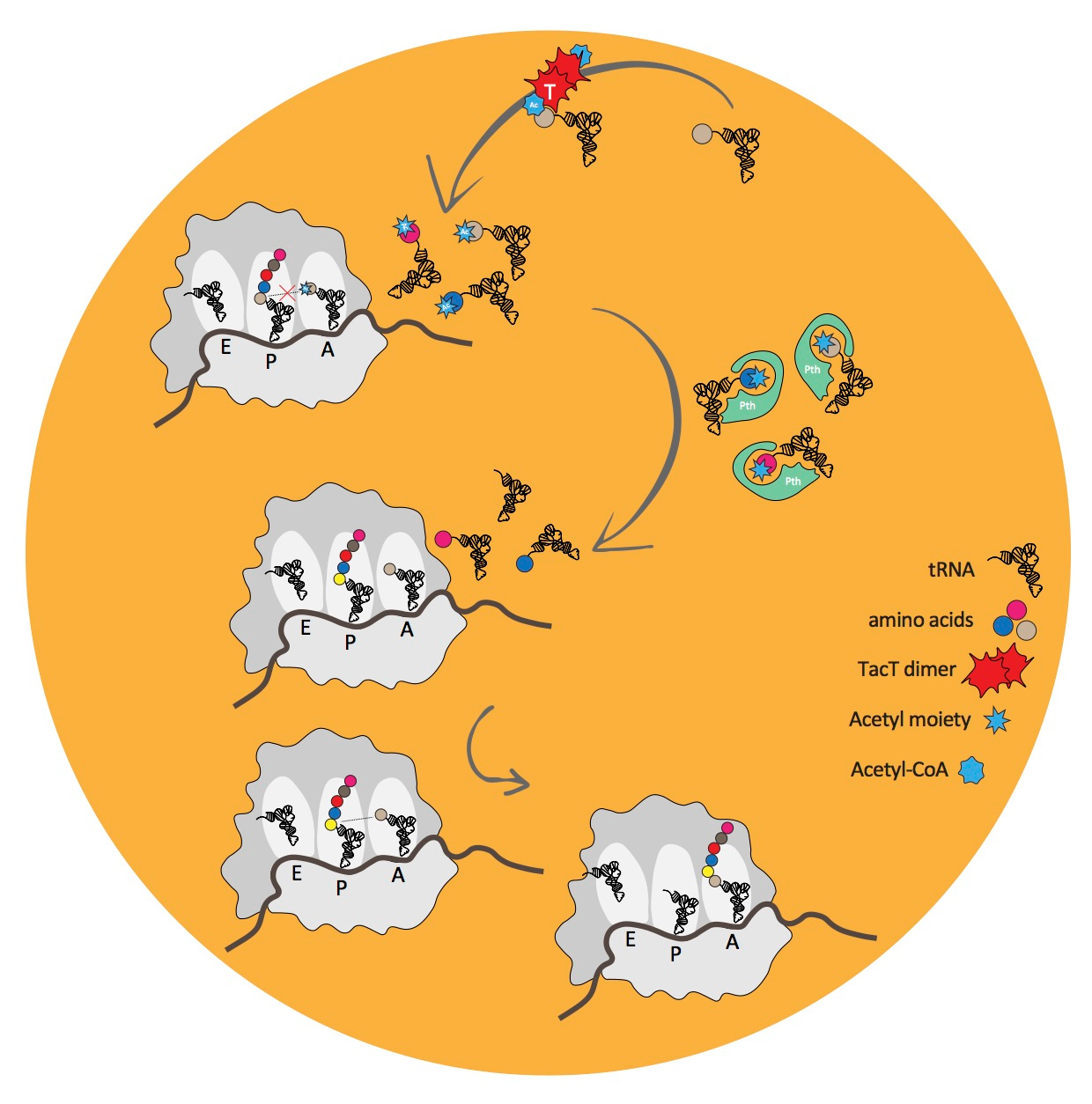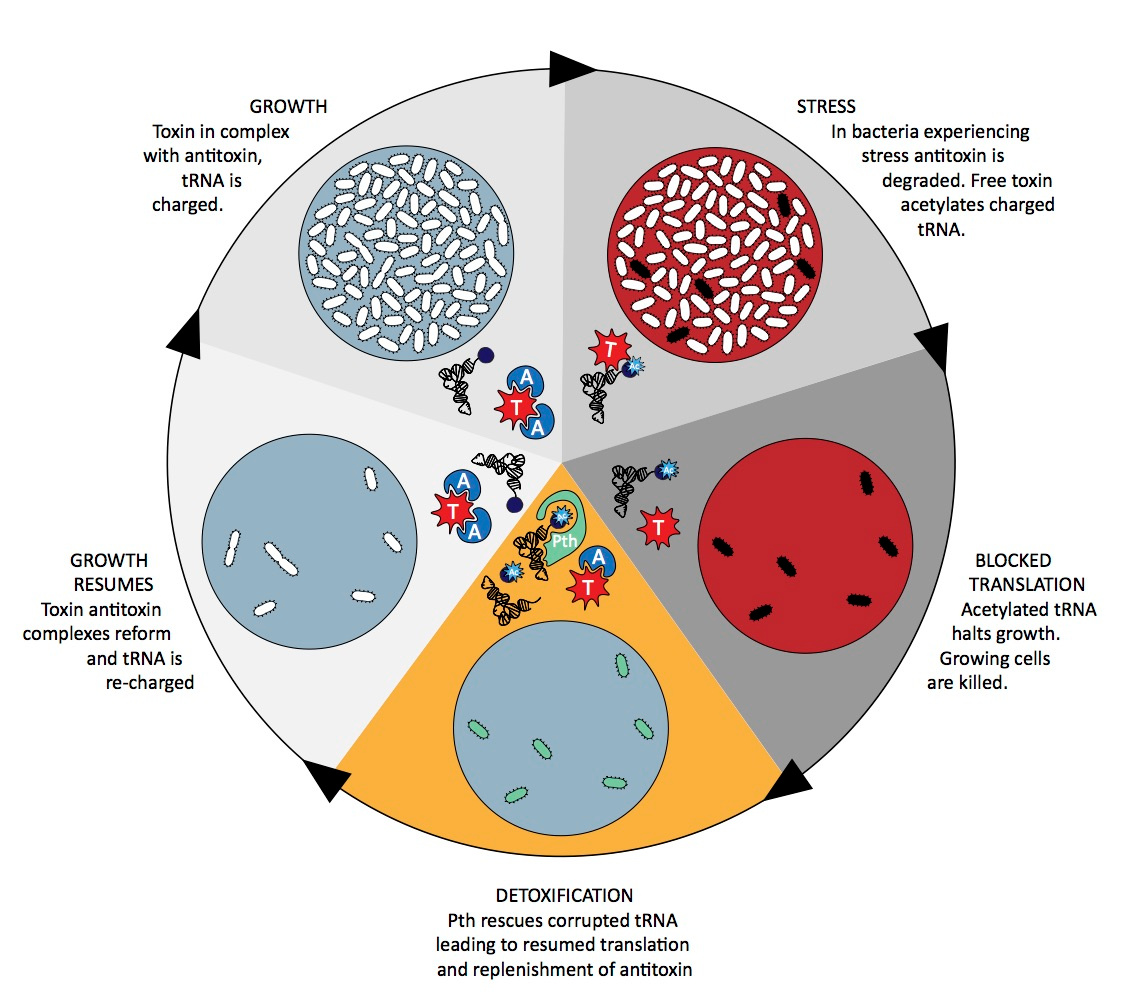 To resume growth the bacteria must detoxify the corrupted tRNA molecules. It can do this using a highly conserved, essential enzyme called Peptidyl-tRNA hydrolase (Pth). The main function of Pth is to recycle tRNA molecules when translation stalls through ribosome drop off. We showed that Pth can also hydrolyse tRNA molecules corrupted by TacT. Perhaps Pth is key in allowing persister bacteria to emerge from their non-growing state, waking up, to create a new infection.