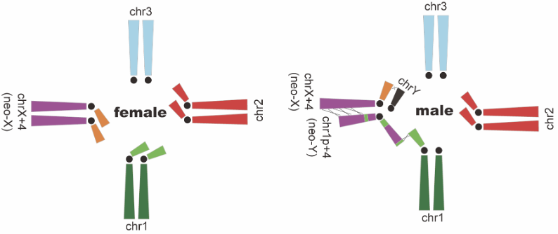 This early work initiated a tradition of studying muntjac deer in Shi’s institute in Yunnan province, where over half of all the plant and animal species across China can be found, including four muntjac species. Another important discovery made later by Shi and his students is the unusual way by which the black muntjac chromosomes pair with each other during male meiosis. Shi showed that males of Indian or black muntjacs have one extra chromosome than their females, because of a translocation between the X chromosome and an autosome, leaving the Y chromosome as the ‘extra’ chromosome in males [3]. And five chromosomes of male black muntjac pair with one another through parts of homologous regions (Figure 2). It was shown later by chromosome painting and BAC clone mapping in black muntjacs[7], that X chromosome was translocated to an autosome chr4 (X+4), and that of the other chr4 was translocated to the short arm of chr1(1p+4) followed by an inversion, creating a pair of chromosomes that do not have homologous recombination across two thirds of its length specifically in males. Such complicated rearrangements only occurred in black muntjac after its divergence from its relative species Gongshan muntjac in less than 1.5 million years. This made this pair of chromosome evolve exactly like a pair of canonical XY chromosome, specifically lacking recombination in males, but much younger (hence they are called ‘neo-sex chromosomes’).