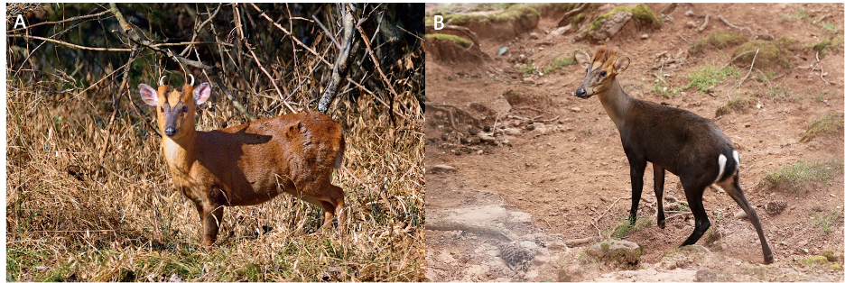 Figure 1A Chinese muntjac (Muntiacus reevesi) and 1B Black muntjac (Muntiacus crinifirons) Photo credit: Baowei Zhang