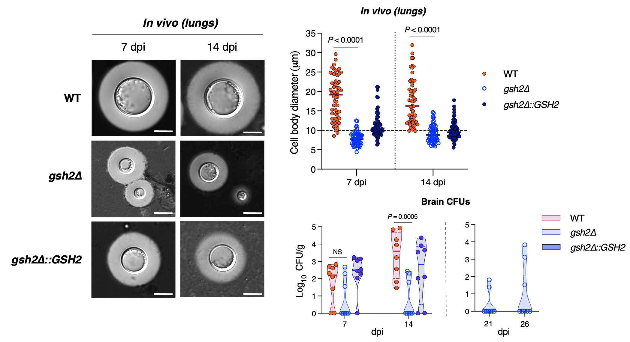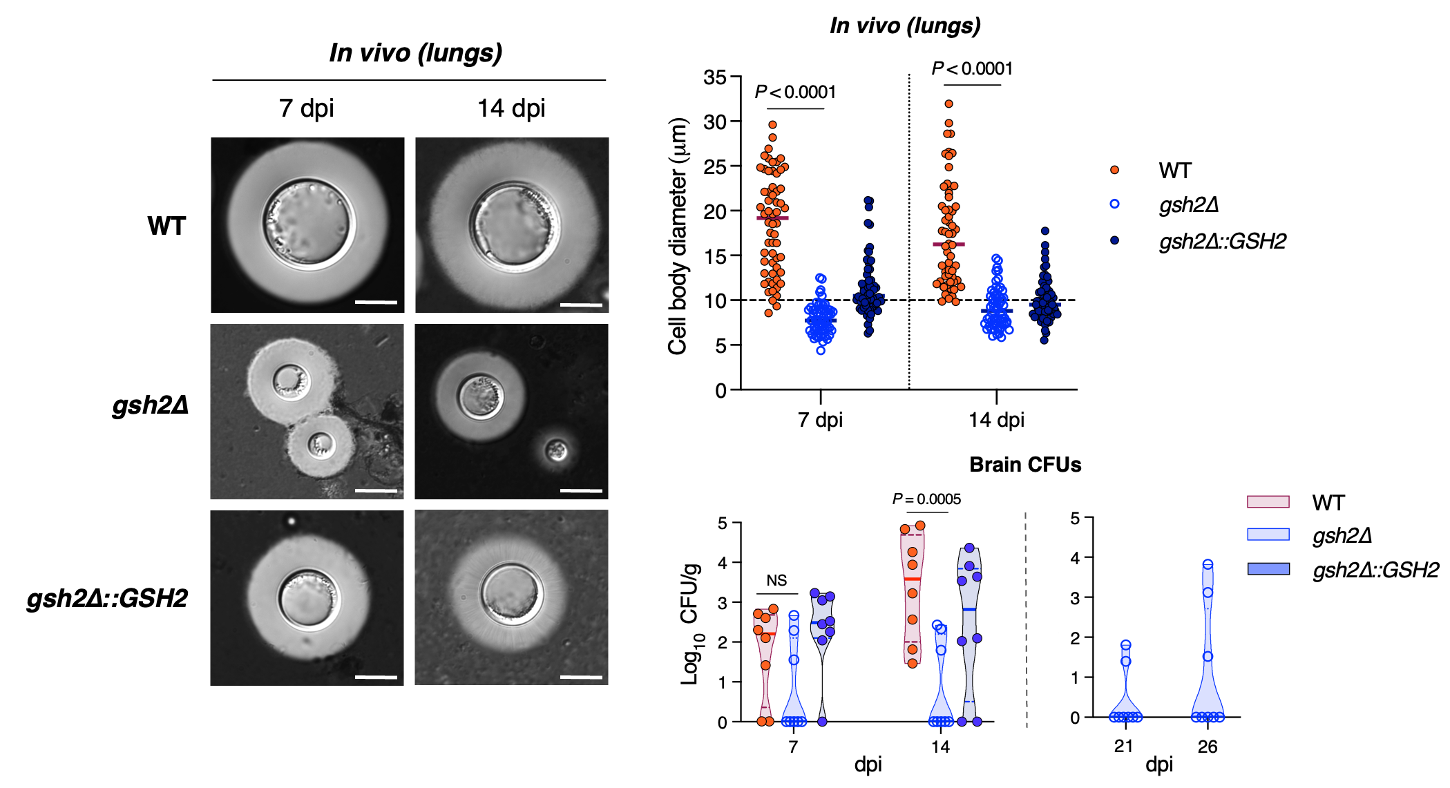 In addition to the melanin and redox changes observed, C. neoformans GSH mutants had reduced migration to the brains of mice. In part, this can be explained by lower phagocytic uptake of mutants, which can impede traversal of the blood-brain barrier via a “Trojan horse” mechanism – a tactic by which C. neoformans invades the CNS by concealing itself within host immune cells. Another contributing factor is the inability of GSH mutants to form titan cells. Titan cells are large (> 10µM) cells linked to cryptococcal persistence and virulence, and their progeny can have enhanced adaptation to stressors in the host environment. Titan cells also skew host immunity to favour cryptococcal survival and dissemination, thereby enhancing disease. This lack of titan cell formation and the reduced cryptococcal cell migration observed with GSH mutants suggest a complex interplay between redox regulation, host immunity and progression of disease.