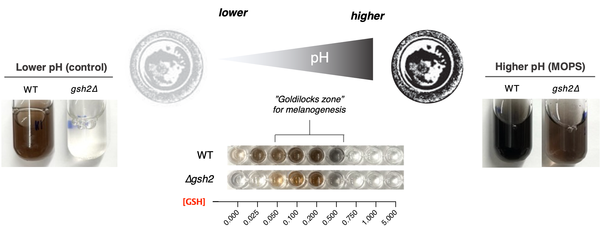 Our work in the Kronstad lab employs omic and genetic approaches that help unravel the mysteries behind the factors responsible for cryptococcal virulence, including how redox-mediated processes influence melanin formation. Recently, we demonstrated that metabolism of glutathione (GSH), a potent antioxidant that occurs abundantly in most cell types of many organisms, is inextricably linked to the processes that facilitate melanin formation. One of our key findings was that genetic mutants of C. neoformans lacking a GSH biosynthesis gene had severely reduced growth and attenuated virulence in mice. This mutation precluded synthesis of GSH by C. neoformans and had unexpected impacts on the extracellular environment. Namely, the extracellular milieu was highly acidified in GSH mutants, and these extracellular changes blocked melanin production (which occurs at the cell wall). Together, we surmised that a precise redox balance (or a “Goldilocks” zone) was required for melanin synthesis to occur, and changes to this balance could block or impair melanogenesis. Changing redox conditions not only impacted melanin formation, but also the response to external stress. Though mutants lacked GSH (a strong antioxidant), they were less susceptible to modest oxidative stress by hydrogen peroxide, and we attributed these changes to extracellular acidification and a low extracellular pH.