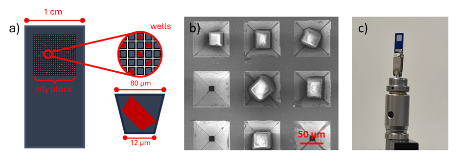 Figure 1 a) schematic description of components in a fixed-target grid, b) SEM image of a section of wells containing a single crystal (x270 zoom), c) an image of the fixed-target grid mounted at the data collection position.