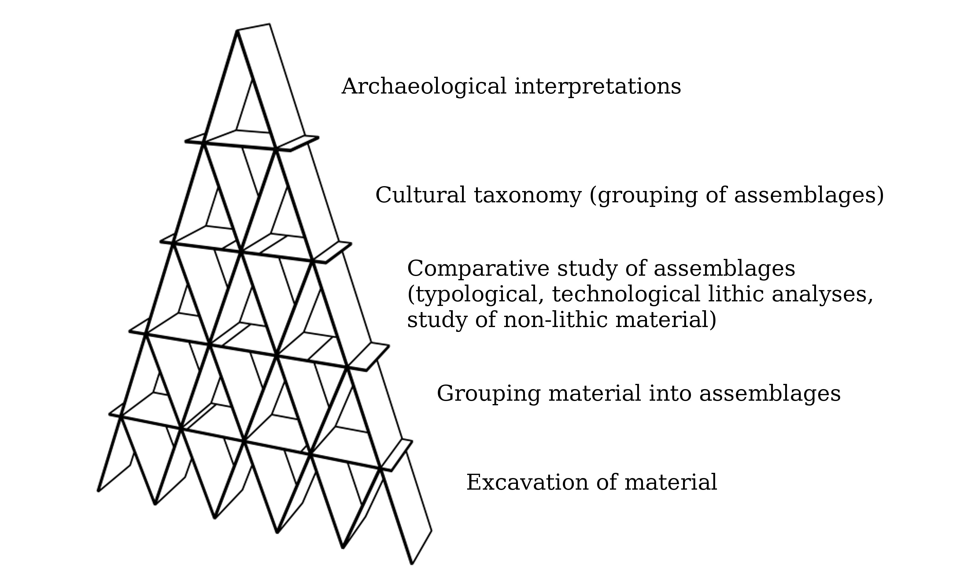 House of cards? Archaeological interpretations of migration, adaptation, and other aspects of past lives during the Palaeolithic build on a pyramid of data that begins with the retrieval of artefacts from the ground. Through various transformations and with many in-between inferences, these objects are turned into data, including the definition of taxonomic groups – cultures – which serve a role much like species or genera in evolutionary biology; they are the units said to change and adapt. The problem is that of cards are pulled out at the base – if certain groupings turn out to be unfounded, the upper stories of this house may tumble down. From Reynolds & Riede (2019), based on an image by Lluisa Iborra licensed under CC BY 3.0; the figure is available at https://doi.org/10.6084/m9.figshare.8293784 and is licensed under CC BY 4.0).