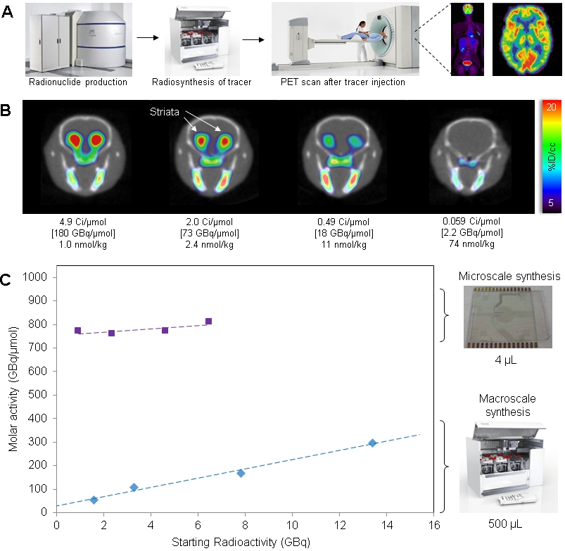 Figure 1: (A) Overview of positron emission tomography (PET). (B) In many cases, it is critical that the tracer produced with high “molar activity”. As shown in this series of PET/CT images of mouse brain, the molar activity of the tracer [18F]Fallypride can have a dramatic impact on the ability visualize the striata (brain regions rich in dopamine D2/D3 neuroreceptors targeted by this tracer). (C) The molar activity depends on the synthesis method and the batch size (amount of radioactivity used). In particular, synthesis in microliter volumes results in very high specific activity compared to conventional approaches over a wide range of conditions, providing a convenient and safe means to obtain high molar-activity radiotracers.