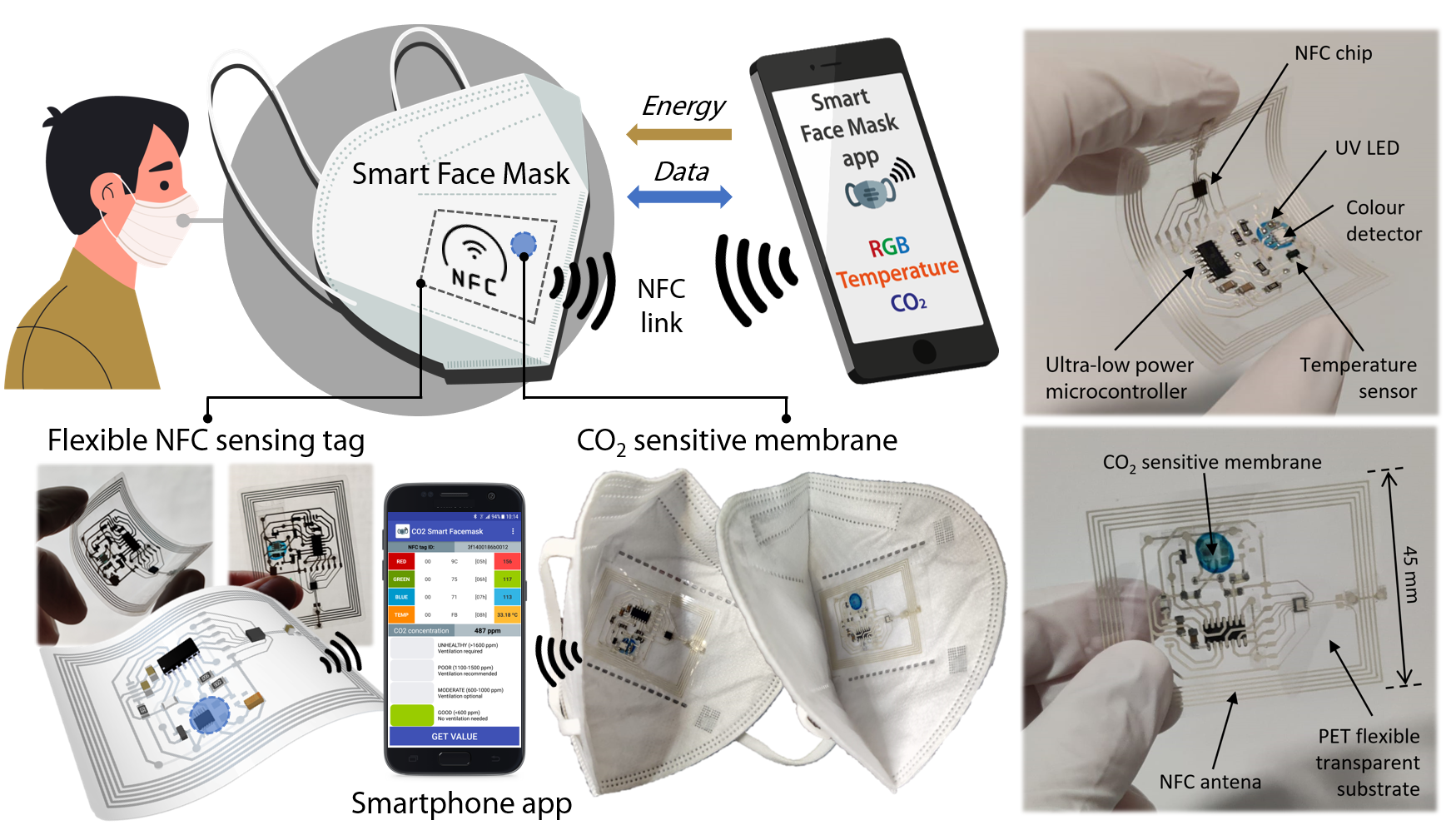 In summary, we have developed a smart facemask system that distinguishes from previous solutions by combining the three following main aspects simultaneously: i) Both the sensor and the electronics are integrated on flexible substrate, thus achieving better conformability and wearability; ii) It is able to determine CO2 concentration, a key parameter during the process of breathing that has been hardly ever contemplated in the current state-of-the-art of sensing facemasks; and iii) It implements wireless powering through RF energy harvesting and data transmission using NFC technology, thus making the system compatible with any NFC-enabled device without modification, including smartphones, through a custom-developed application. All these features strengthen the potential applications of the proposed device in the fields of non-invasive health monitoring, preclinical research, prognostics and diagnostics with wearable electronics.