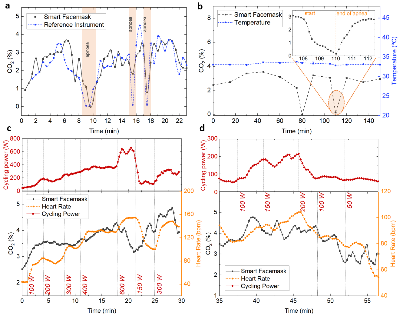 The performance of the developed smart facemask was also assessed during a graded cycling exercise test by monitoring the data delivered by the instrumented facemask as well as the cycling power and heart rate (HR). Fig. 2c and 2d depict the 4-period Simple Moving Average (SMA) of the calculated CO2 concentration and HR as the cycling power varies during the cycling exercise test. Both figures also include the SMA power during the exercise. This parameter is closely correlated to the HR trend (see red and orange lines). These tests showed that the concentration of CO2 in the breathing zone while wearing the facemask during the exercise increased by approximately 1.9%, which is in line with other studies found in the literature. Our results are in line with the reviewed literature, with CO2 values around 2% during low work-rate activities (Fig. 2a-b) and peak values up to ~5% during high-intensity exercise (Fig. 2c-d). Even though the conducted performance tests do not constitute a formal clinical trial, their purpose is to give an idea of the potential of the developed system in the field of wearable electronics for non-invasive health monitoring.
