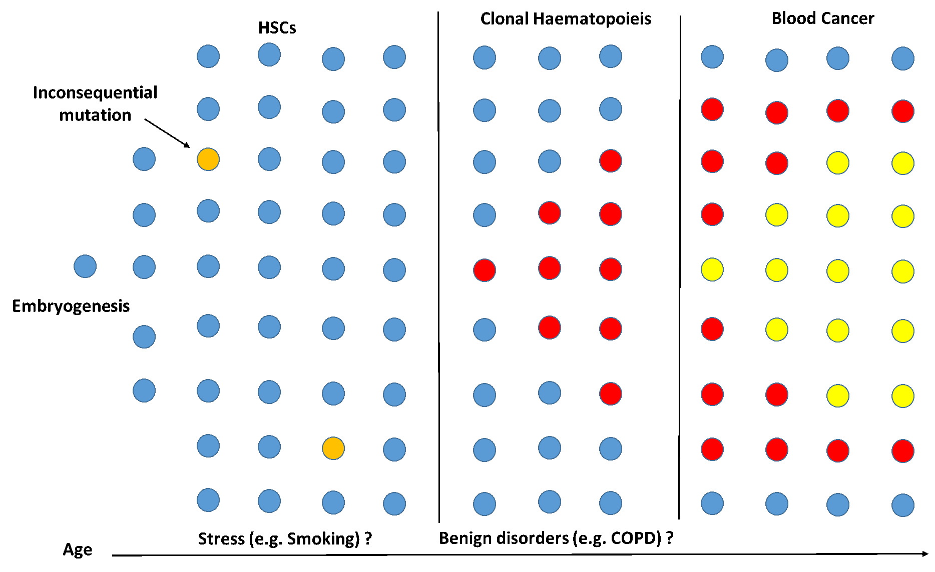 The dynamic and age–related process of acquiring mutations in healthy tissues provides insights into environmental exposures as well as the internal molecular factors that shape the development of clonal hematopoiesis (CH). In particular, acquiring a mutation that confers a selective growth advantage to hematopoietic stem or progenitor cells alters the process of hematopoiesis, resulting in the generation of clonal blood cells and an elevated risk of developing blood cancer. Although highly significant, the absolute risk of developing blood cancer is low (about 1-2% per annum) but clonal blood cells may have a wider effects on non-hematopoietic organs since blood cells are widely distributed within tissues, and clonal changes may potentially alter the immune response and promote an inflammatory state (Fig 1).