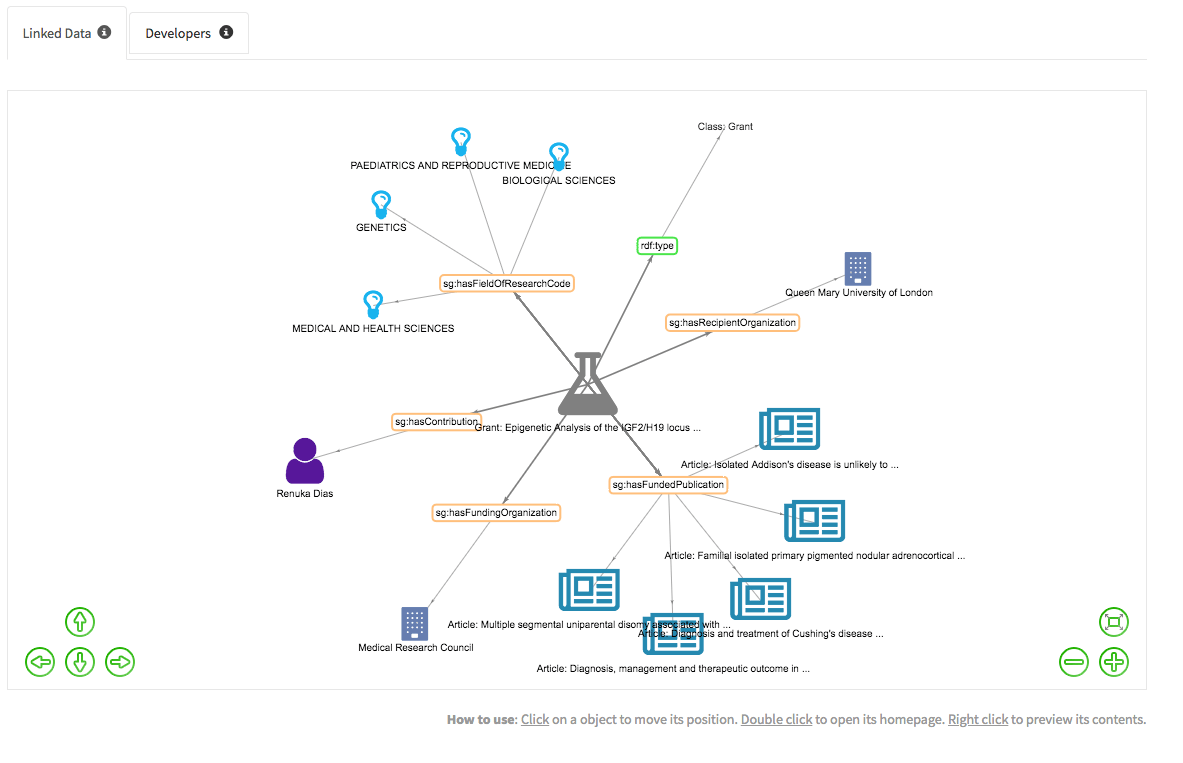 Finally, we improved the linked data visualization included in every page by adding distinctive icons to each object type - so to make it easier to understand the immediate network of an object at a glance. E.g. see this grant: