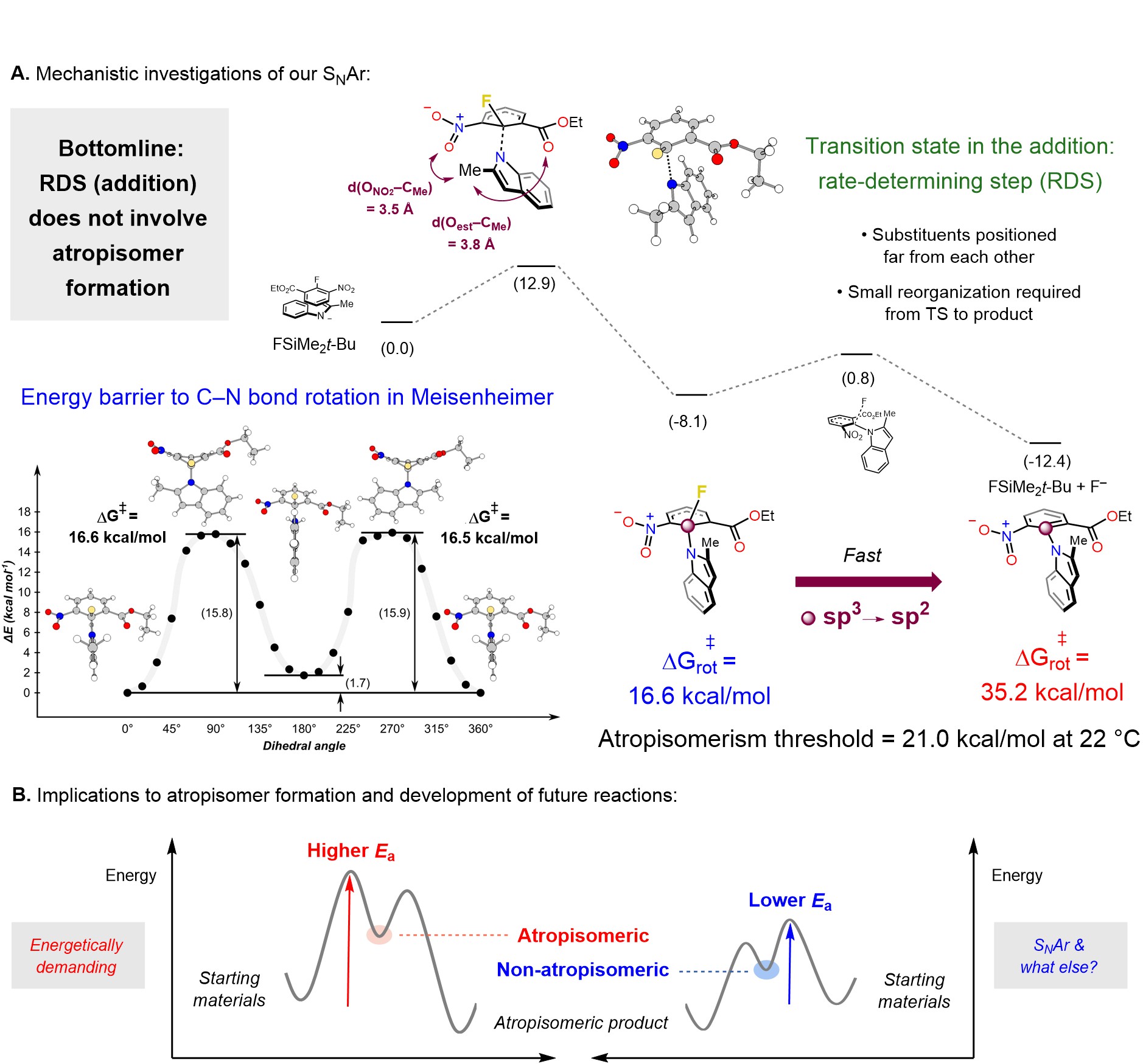 We were puzzled by the broad scope and efficiency of the reactions, specially because we were dealing with compounds that are notoriously difficult to synthesize. We teamed up with Daniel Bím, a scientist starting his independent career at University of Chemistry and Technology (UCT Prague, 400 m away from us) for DFT calculations. We observed reactions proceed in a stepwise fashion; because the electrophile is activated, a stable Meisenheimer intermediate is formed and the addition step is rate-determining. Nothing new about this. However, a closer look into the Meisenheimer reveals that this intermediate is not atropisomeric because its C─N barrier to rotation is lower than atropisomerism threshold and less than half of that of the product. (Figure 4A). Why does this matter? Because this shows sterically hindered compounds (atropisomers) can be synthesized through transition states that might not be hindered (non-atropisomeric). We hope this idea can help chemists to develop better methods toward synthesis of sterically hindered compounds (Figure 4B).