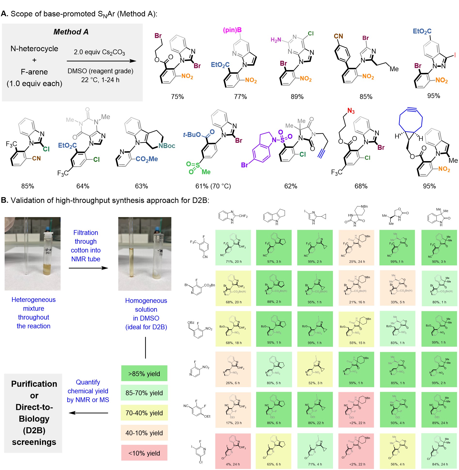 The developments. Our optimized SNAr conditions are accessible to any laboratory in the world (Figure 1C). It takes one equivalent of the N-heterocycle, 1.0 equivalent of the fluoro(or chloro)-arene, 2.0 equiv of Cs2CO3 and reagent grade DMSO in an open container. The scope is extremely broad, and we call the base-promoted process method A (Figure 2A). Of course, pKa considerations are relevant and we have got N─H ranging from 10-21 pKa units to work, and fluoroarenes need to be electron deficient though we show that by increasing temperature even unactivated electrophiles engage productive atropisomer formation. To make it more appealing to medicinal chemists, we validated a high-throughput synthesis approach (Figure 2B) that can be implemented in Direct-to-Biology (D2B) screenings[5]. Why could this be done? Because SNAr reactions are high yielding, produce insoluble salts that can be filtered off as by-product, and are carried out in DMSO, often the solvent of choice in medicinal chemistry screenings. We show herein some of the atropisomers we synthesized, but please note one must go to Supplementary Information to see all that can be done. We provide synthesis of a large number of heterocyclic C─N atropisomers which are diverse and diversifiable!