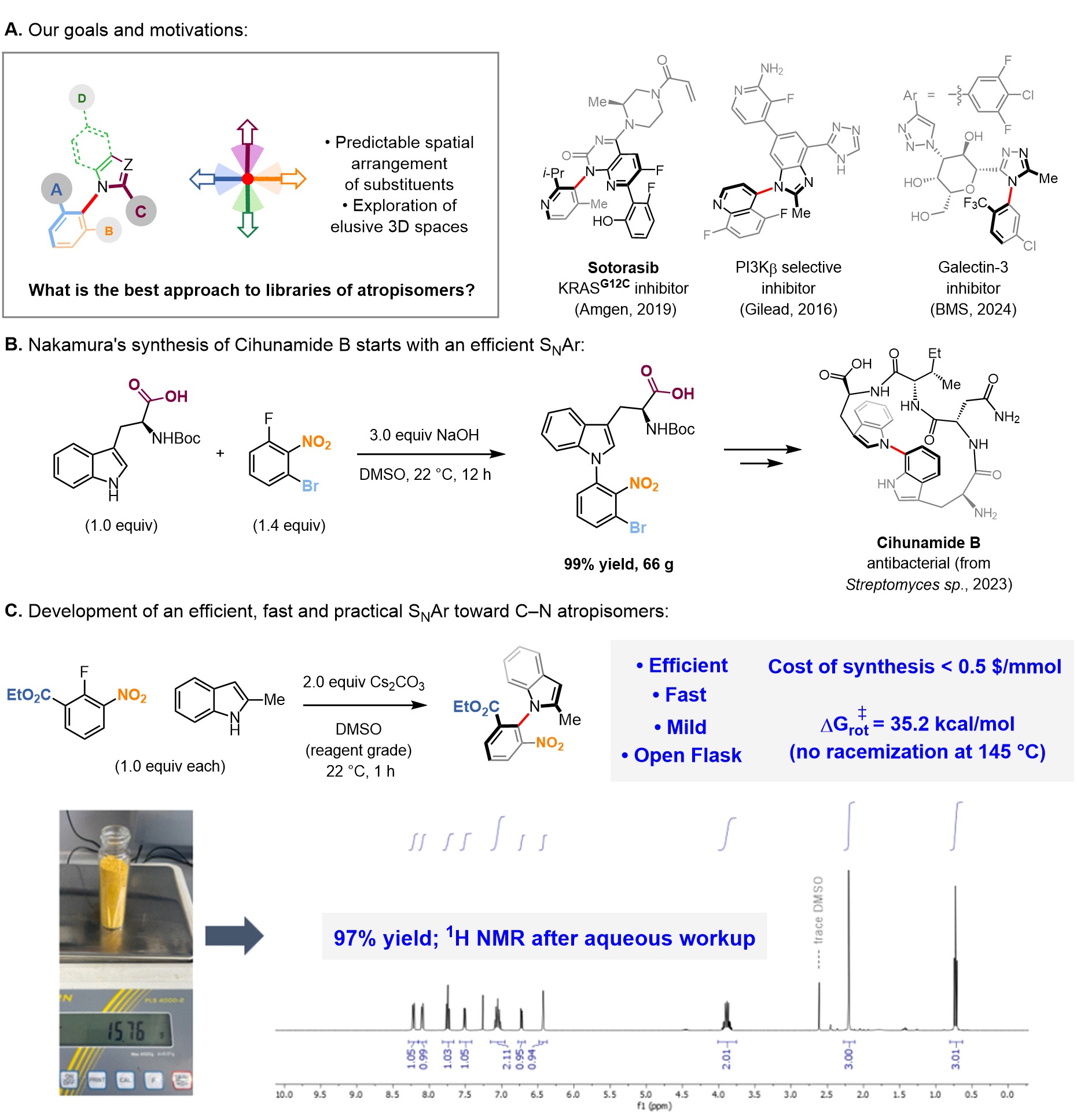 The beginnings. When we started setting up our laboratory at IOCB in Prague we were eager to develop synthesis methods and strategies toward atropisomers, conformational isomers which are becoming increasingly popular in drug discovery[1]. Our main goal was to provide efficient, fast, modular and programmable ways to synthesize libraries of drug-like atropisomers for Med Chem. Two intrinsic features of atropisomers are the most crucial when thinking about and justifying our projects (Figure 1A). First, atropisomers are sterically hindered compounds; thus, presumably, if one develops efficient reactions toward their synthesis, one will be developing efficient reactions per se. Second, atropisomers are three dimensional, currently the most elusive and sought after shape of bioactive molecules employed in early stages of medicinal chemistry screenings[2],[3]. As one can imagine, to work on such topic while establishing the new laboratory came with numerous challenges but as the saying goes, “necessity is the mother of invention”. While we were purchasing and organizing chemicals and instruments, we came across Nakamura’s magnificent synthesis of Cihunamide B[4], an intriguing and naturally-occurring antibacterial atropisomeric macrocyclic peptide (Figure 1B). The first step in the synthesis was an efficient nucleophilic aromatic substitution (SNAr) involving a Boc-protected tryptophan with a free carboxylic acid (!) unit and an active aryl fluoride. A literature search revealed such reactions, at least for indole and carbazole derivatives, were efficient for synthesis of relatively unhindered C─N bonds, but would SNAr allow for efficient and broadly applicable synthesis of C─N atropisomers? Answering this question led us to an enjoyable and somewhat unexpected journey, to the point where it is now perhaps not an exaggeration to consider SNAr as being a click reaction between N-heterocycles and electron-deficient fluoroarenes. We developed practical conditions to synthesize many diversifiable atropisomers which can give rise to an even larger number of drug-like three dimensional compounds. Possibilities are endless, and we expect this work to be employed widely by medicinal chemistry groups. It is amusing but not surprising that inspiration came from a target-oriented approach, underscoring why we will continue to read about and study natural product total synthesis in our group meetings.