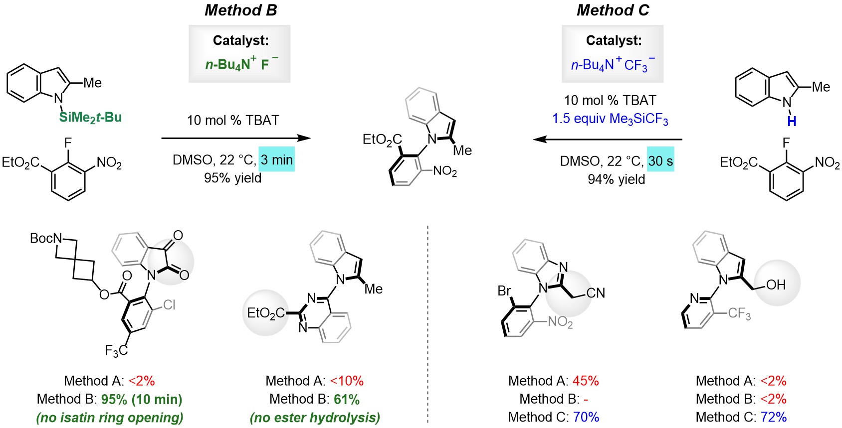 Of course, we had some problems in scope along the way and, if we were to develop atroposelective versions, perhaps method A is not ideal because controlling background reactivity might be difficult. To address those and other problems, we developed not one but two catalytic SNAr variants (Figure 3): 1) method B employing N─SiR3 heterocycles and TBAT (or TBAF) as catalyst[6], and 2) method C, an improved version employing N─H heterocycles directly, and promoted by Ruppert-Prakash’s reagent (Me3SiCF3) in combination with a fluoride source[7]. Among other advantages, the catalytic methods can lead to faster reactions (in cases complete in seconds) and functional groups that do not tolerate bases such as Cs2CO3 can survive.