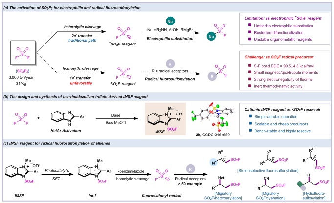 Sulfuryl fluoride (SO2F2) as abundant inflammable industrial feedstock could serve as economic sulfonyl fluoride source. Sulfuryl fluoride derived fluorosulfonylating reagents are mainly electrophilic “FSO2+” synthons and have been employed for direct functionalization of different nucleophiles including organometallic reagents, phenols, amines, etc. However, the construction of diversified sulfonyl fluoride compounds was limited by single electrophilic reaction pattern and hindered multifunctionalization of SO2F2 and derivatives. In contrast, adopting a radical synthesis strategy can overcome the limitations of electrophilic fluorosulfonylation and expand the scope of application of sulfonyl fluoride. However, the generation of fluorosulfonyl radical (·SO2F) from inert SO2F2 gas has met with inevitable difficulties due to the relatively small magnetic/quadrupole moments and the high homolytic bond dissociation energy of the S(VI)-F bond (BDE = 90.5±4.3 kcal/mol)1 (Fig. 1a).