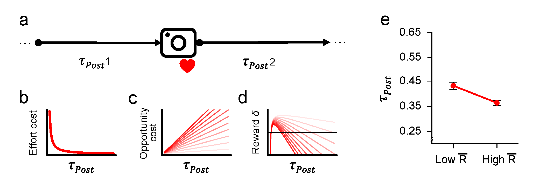 In order to derive theoretical predictions about what would characterize reward learning on social media, we turned to a computational model developed by neuroscientist Yael Niv to explain rodent “free-operant” behavior in Skinner Boxes. Free-operant means that the animal can decide not just what to do (typically pressing a lever), but also how often (typically thousands of times) to do it, which seemed to correspond directly to how Instagram users post whenever and as often as they please. In brief, Niv’s model states that the rodent should select the response rate that maximizes their average rate of food rewards while minimizing the effort of acting and the rewards potentially missed out on by inaction. We applied a modified version of this reward learning model to the data from Instagram to directly test the prediction that social media engagement is driven by the same principles as animal reward learning. This prediction was strongly supported. Qualitatively, our results showed that people spaced their posts in a way that maximizes the net rate of reward: they posted more frequently in response to a high rate of likes, and less frequently when they receive fewer likes. Quantitively, the reward learning model accounted for the precise distribution of posting times better than many alternative models. Critically, this was the case both for our study of Instagram and the three social media discussion forums analyzed in Study 2