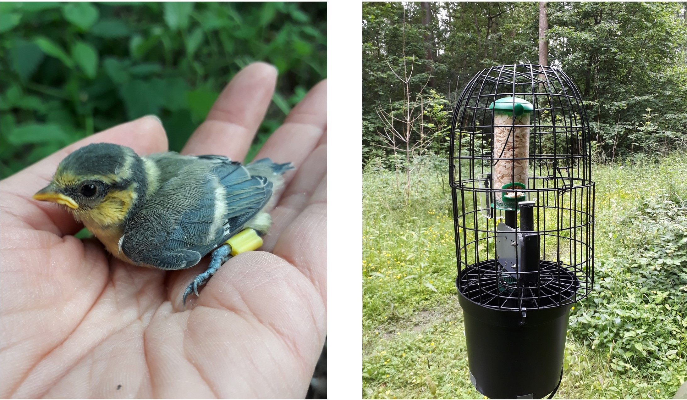 Madingley Wood in Cambridge provided an ideal field site for the experiment. The site has an ongoing long-term study of blue tit and great tit populations, led by Hannah Rowland (Max Planck Institute for Chemical Ecology). Throughout the year, we spent many mornings catching birds with mist nets and fitting them with RFID tags. This was managed by Tony Fulford (University of Cambridge) and many volunteers who provided invaluable help keeping a high proportion of the bird population tagged. We could then record birds’ unique RFID tag codes at the feeders, and this way monitor each individual’s foraging decisions and social associations.