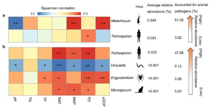 Figure 2. Significantly associated dominant animal pathogens with socioeconomic factors at the global (a) and local (b) scales.