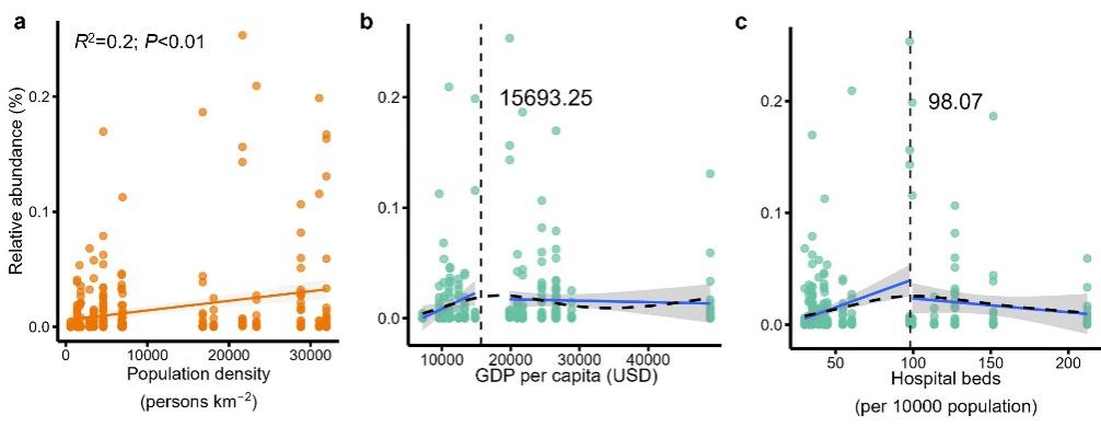 Figure 3. Linear and non-linear responses of the relative abundance of Trichosporon to population density (a), GDP per capita (b) and hospital beds (c) in urban greenspaces at the local scale.