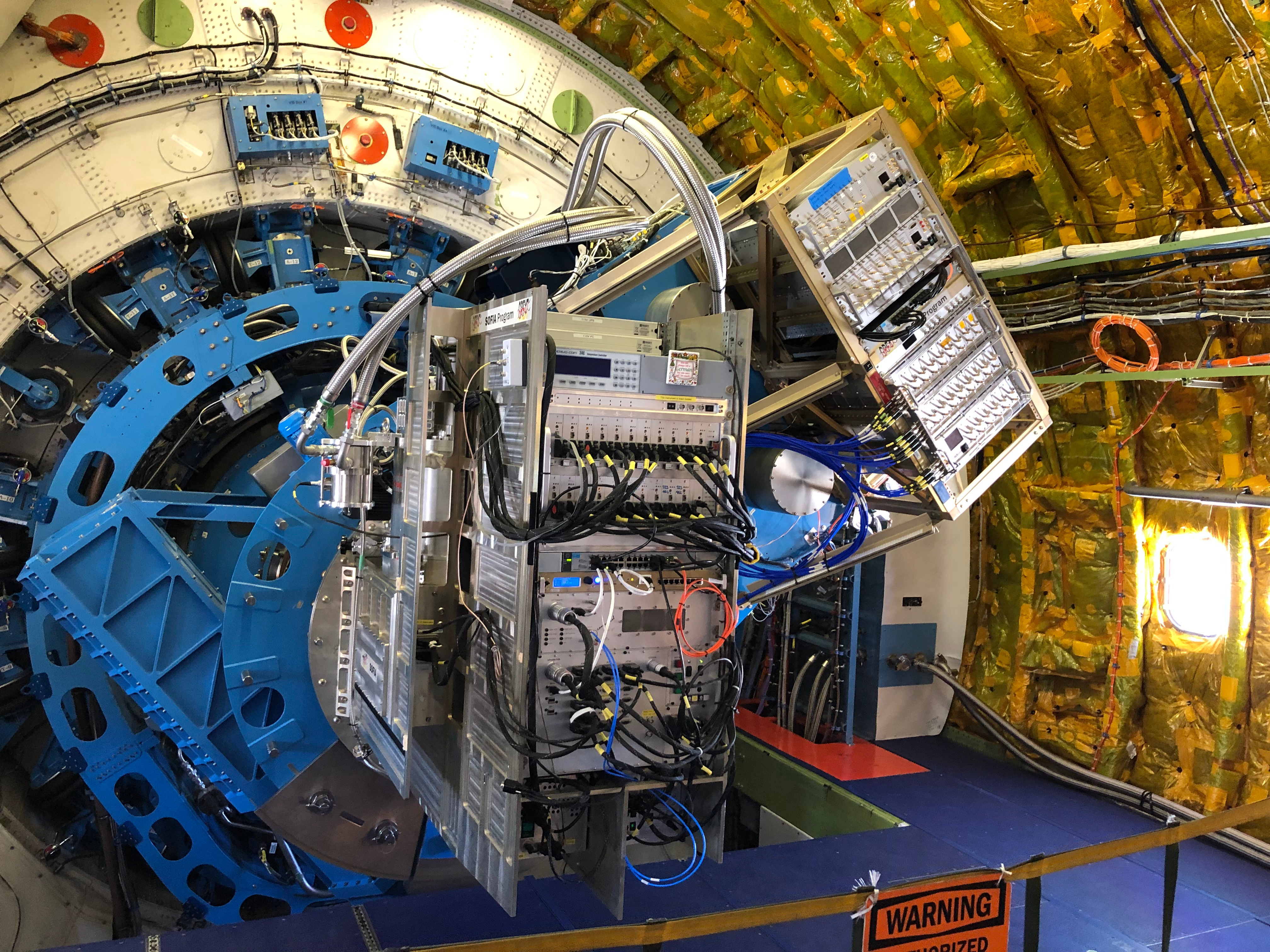 The 2.5m mirror can go between elevations of 23 and 60 degrees, with a plus-minus horizontal movement of 3 degrees. It is isolated from the aircraft – once it is locked on source, it tracks independently of the motion of the aircraft, sitting in its own inertial frame. Each flight has a unique flight path, with separate legs devoted to single sources. I asked why the telescope could not point to the zenith, where the air mass would be lowest. The answer is twofold. Importantly, it would be difficult to track a source for any length of time. But there was the practical matter of cutting a big hole in the side of an airplane.