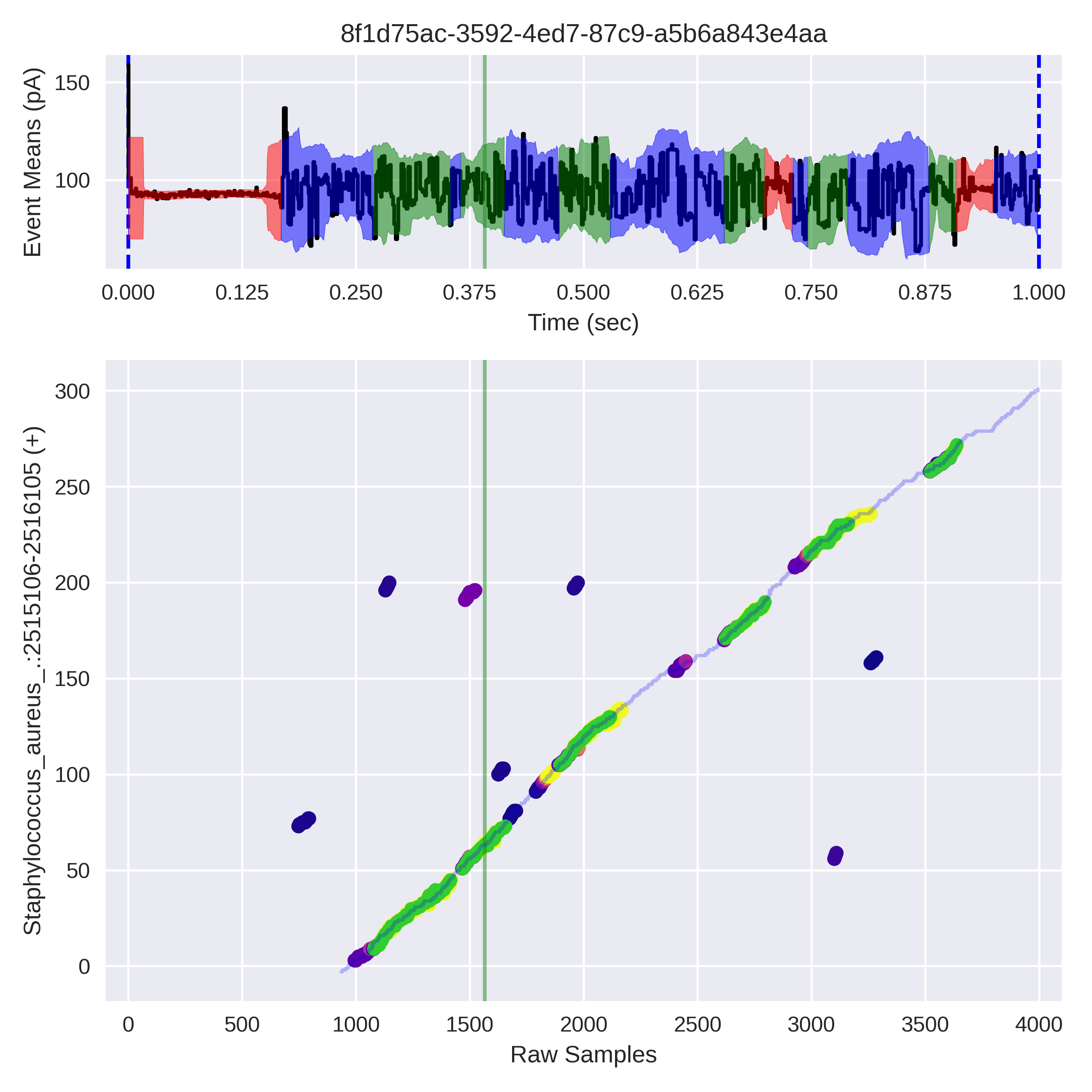 Recent work on improving the algorithm. Top: signal from the first second of the read showing mapped events (green), unmapped events (blue), and ignored events (red). Bottom: a signal-to-reference dotplot, showing the signal correctly aligned by UNCALLED (green), other alignments considered by UNCALLED (dark blue/yellow gradient), and the basecalled alignment translated into signal-space (light blue).