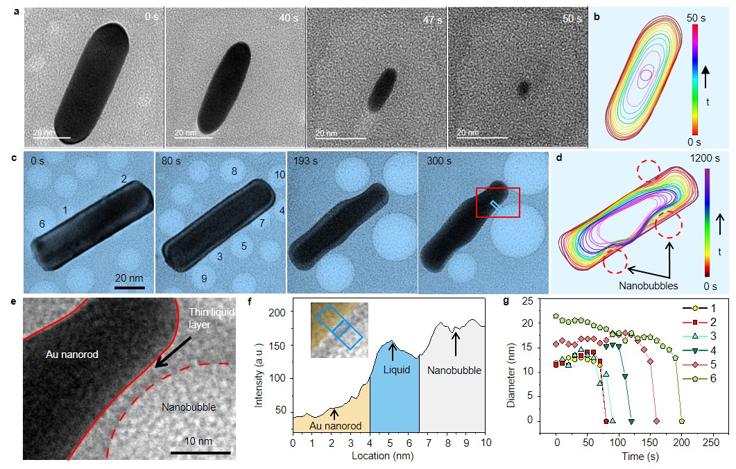 Fig. 2. a, Sequence of in situ TEM images showing the morphology changes of Au nanorod during etching without nanobubbles. b, The corresponding contour map highlights the uniform shape evolution of the nanorod. c, Time sequential TEM micrographs show the real-time shape evolution of the nanorod during the etching. Images are extracted from Video 1. d, The corresponding contour map highlights the indents developed near the nanobubbles. e, The enlarged figure (marked with red rectangle in a) clearly shows the thin liquid layer between the nanorod and nanobubble. f, Intensity profile of the selected area shown in c. g, Diameter changes of nanobubbles with time. The numbers represent the different nanobubbles marked in a.