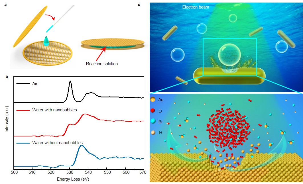 Fig. 1. Schematic illumination of a solid-liquid-gas reaction established in a liquid cell. a, Schematic liquid cell encapsulating a reaction solution. b, Electron energy loss spectroscopy (EELS) shows O K-edge of air (black, reference spectrum from Gatan EELS Atlas), water without nanobubble (blue) and the water with nanobubbles generated by electrolysis of water at a later stage (red). The O K-edge of water with nanobubbles shows evidence of molecular O2 at ∼527 eV as compared with the reference spectrum from O2 gas (black). c, Schematic illustration of the etching of gold nanorods in HBr solution with O2 nanobubbles in the near distance.