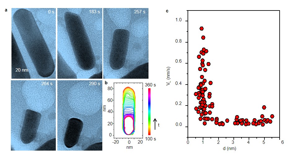 Fig. 3. Real-time observation of a gold nanorod etching with an O2 gas nanobubble at the end of the nanorod. a, Sequential TEM images of the Au nanorod during etching. b, The time-labeled contours 5 show the shape evolution of the gold nanorod in a. c, A statistic plot showing the longitudinal etching rate as a function of the distance between the nanobubble and nanorod surface.