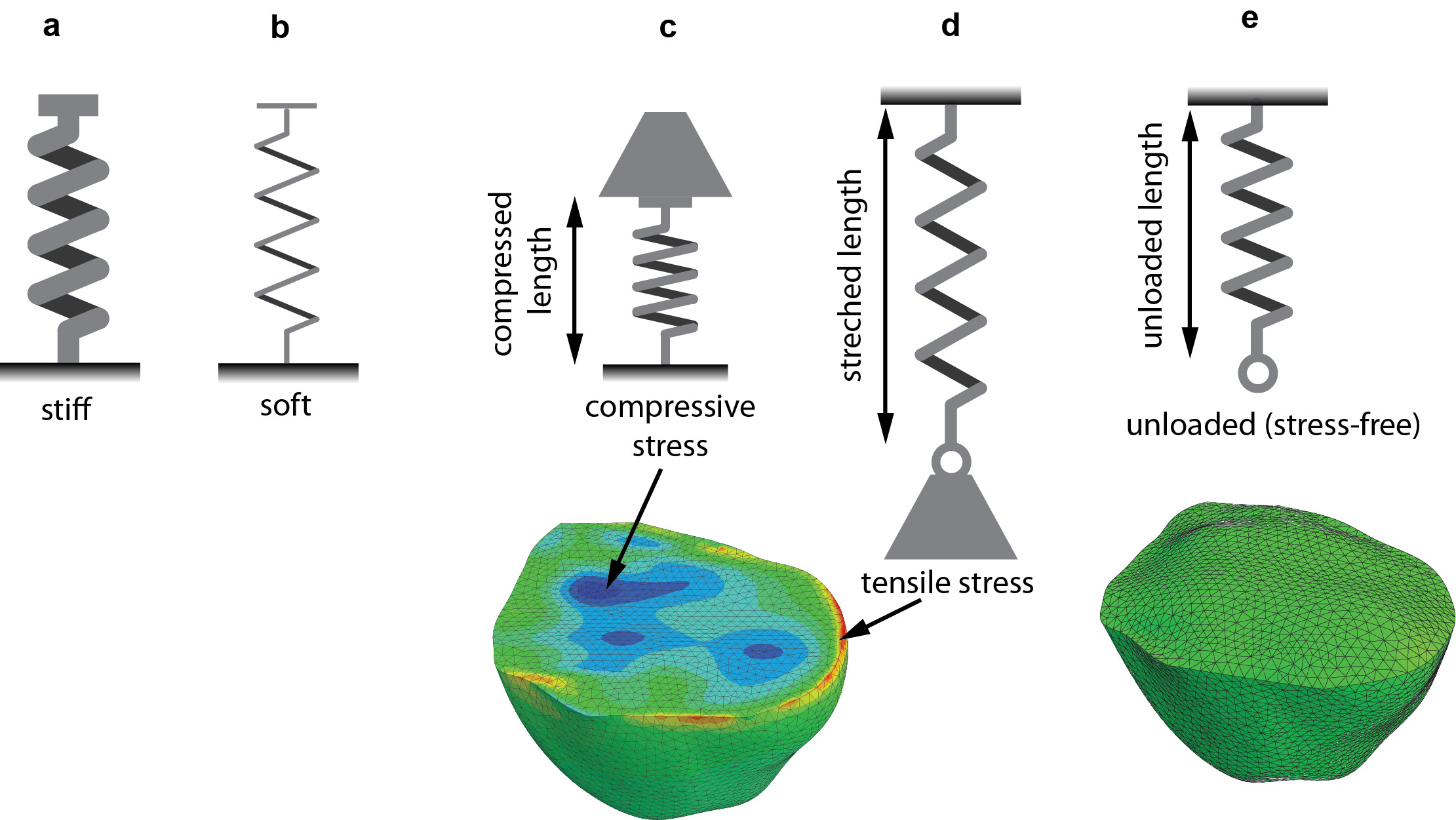 Figure 1. Spring analogy for (a) stiff and (b) soft tumors. Independently of being soft or stiff, tumors can be under (c) compressive or (d) tensile solid stresses. (e) To measure the solid stress in tumors, the stress is released at the plane of interest (here shown for the planar-cut method), and the stress-induced displacement is used to calculate the solid stress via mathematical modeling.