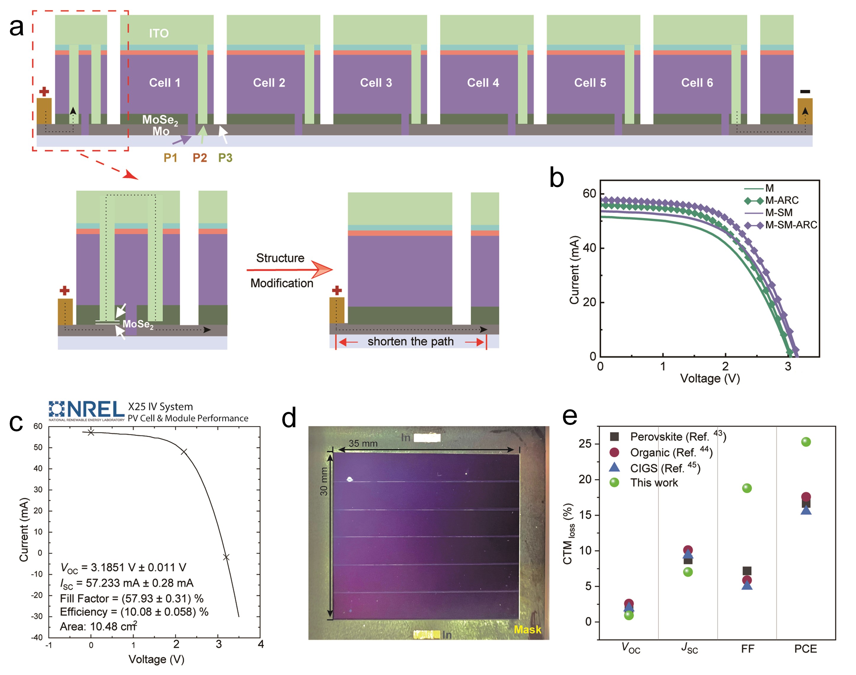 Figure 2. kesterite module structure modification and cell to module (CTM) losses. (a) Cartoon of the module structure and structure modification (SM). The black dotted line is the flow of the current. (b) The I-V curves of the primary module without (M) and with antireflective coating (M-ARC), module after structure modification without (M-SM) and with ARC (M-SM-ARC). (c) The I-V curve of the NREL-certified 10.08% efficient kesterite module. (d) Picture of the obverse side of the certified module. The area is defined by the mask. (e) Comparison of the CTM losses of the emerging thin film solar modules (Perovskite, Organic, and CIGS).