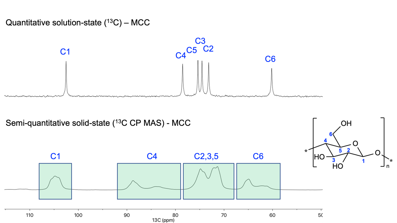 Figure 1. Comparison of a solution state 13C NMR obtained in the [P4444][OAc] electrolyte (Top) and a solid state 13C NMR spectrum, as is standard in cellulose research (Bottom), of the same microcrystalline cellulose model compound. With the featured protocol the inherently higher chemical resolution of solution state NMR can now also be exploited in cellulose research.