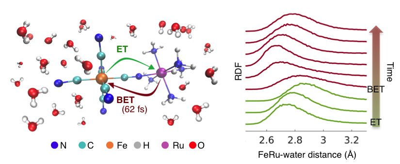 With the help of molecular dynamics simulations, we discovered that, in the short lifetime of the electron transfer process (~62 fs), the solvent molecules in close proximity to the FeRu molecule undergo the largest nuclear displacements and that the X-ray scattering signals reported exclusively on short-range solvation dynamics. Specifically, we monitored the concerted motion of the water molecules hydrogen bonded to FeRu ligands: these molecules translate away from the solute when hydrogen bonding interactions are weakened upon metal-to-metal charge transfer, and then oscillate back to the original position upon back electron transfer (Figure 1).