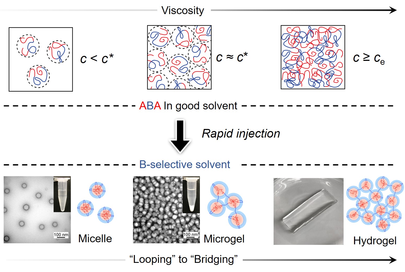 While we were exploring new methods for creating nanostructured colloids, we found that, rapid injection, a method widely used for preparing supramolecular colloidal structures, has shown great promise for block polymer self-assembly. The method is very easy to perform and takes very little time. All we need to do is to dissolve the block polymer in a good solvent, and then inject the polymer solution into a selective solvent like water (see Supplementary Video 1. The self-assembly begins when the polymer solution meets the water, and is completed within minutes. With just one polymer, we were able to prepare different materials including micelles, microgels, and hydrogels using rapid injection by changing the initial polymer concentration.