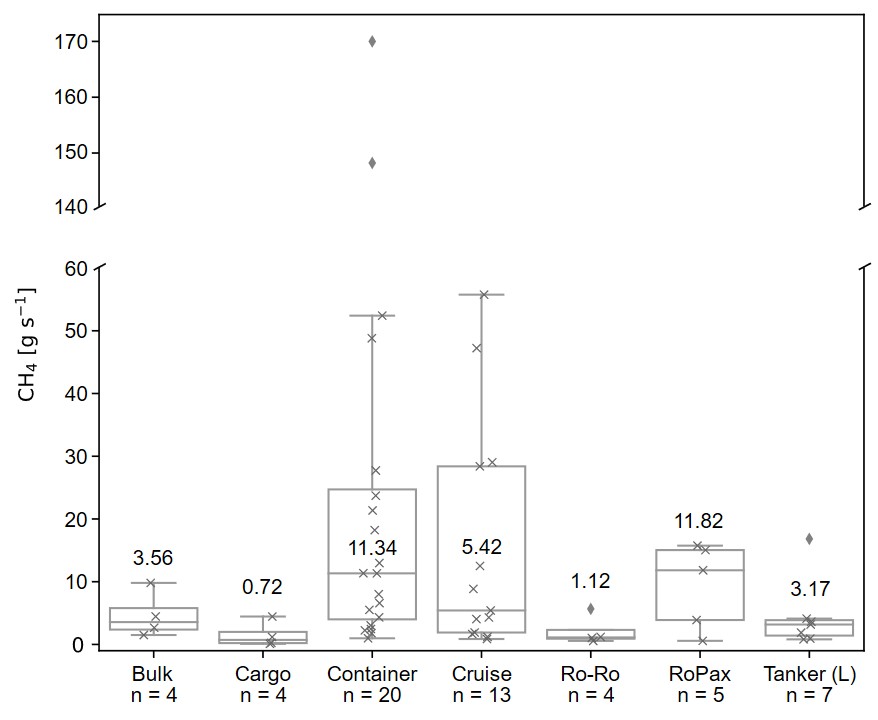 Figure 6. Methane (CH4) emission (g s–1) for seven different ship types. The number at each box indicate the median CH4 emission, indicated by the horizontal line inside each box, the individual datapoints are denoted by grey x-symbols, and grey diamonds show outliers. The number of passages (n) for each ship type is indicated on the x-axis. Note the broken y-axis for the two highest container observations.