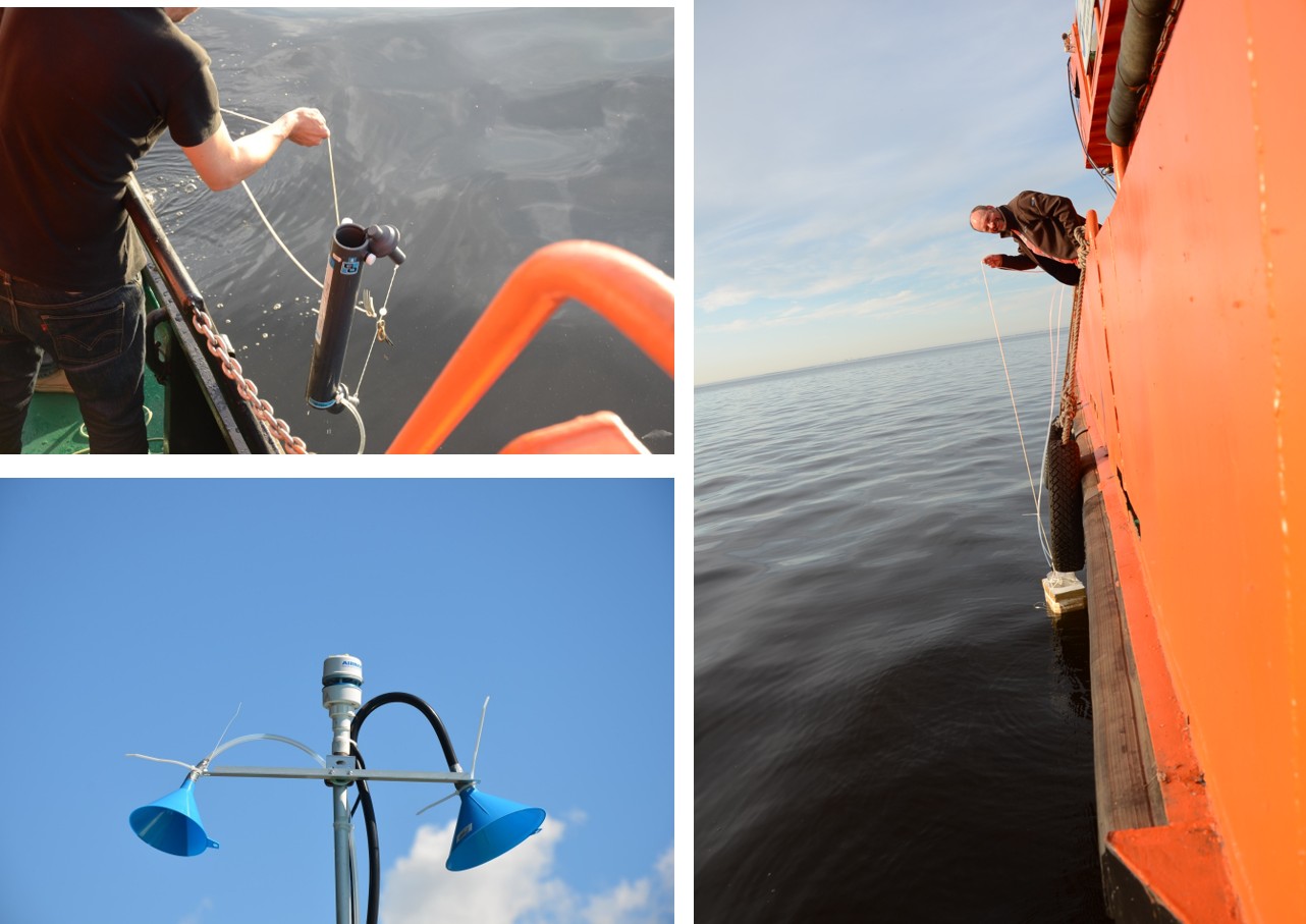 Figure 4. Water sampling (top left), floating chamber measurements (right), and the gas inlets for the methane observations and the Airmar instrument used for wind measurements (bottom left). Photos: Johan Mellqvist.