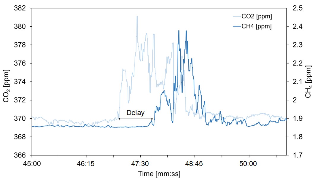 Figure 3. Observed carbon dioxide (CO2) from the ships exhaust plume and delayed methane (CH4) emissions downwind a passing ship. A typical delay of ~50s between the CH4 and CO2 plumes, is clearly visible and indicated by the black arrow.