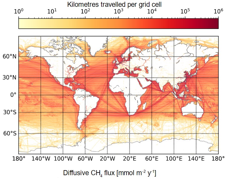 The global oceans are intensively trafficked by ships, and the intensity is especially high in coastal and estuarine areas (Figure 1) which are important sources of methane emitted to the atmosphere through diffusion or the release of bubbles (ebullition). Our recent study, published in Communications Earth & Environment, shows that when ships travel through shallow, methane-rich waters, the resulting pressure changes and water mixing can trigger significant methane emissions from the seafloor – emissions that rarely are captured by current field measurement approaches (Figure 2).