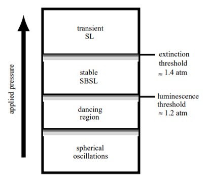 In 1934, Hermann Frenzel and colleagues first technically observed sonoluminescence in the lab at the University of Cologne, when they added an ultrasound transducer in a tank of photographic developer fluid [Frenzel 1934]. The process serendipitously led to the formation of tiny dot-like bubbles in the film that emitted light in the presence of active ultrasound. This event is known as multi-bubble sonoluminescence. The remarkable properties of the phenomenon include the transduction of acoustic energy into light energy with a brief light emission lifetime. Applied physicist T.J. Matula demonstrated the initial cavitation and single-bubble sonoluminescence to elaborate on its mechanism-of-action, which occurred between the threshold of luminescence and extinction (Figure 1) [Matula 1999].