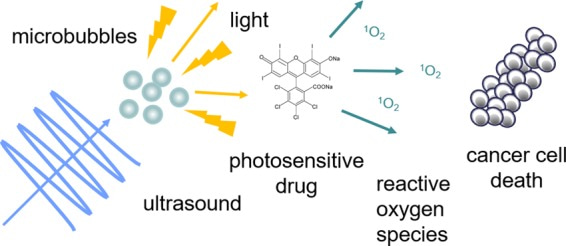 Figure 2: The activation of a photodynamic therapy agent using microbubbles and ultrasound. Ultrasound can accurately focus on larger tissue depths, opening potential for chemotherapeutic drug delivery to reach solid tissues [Beguin 2019].