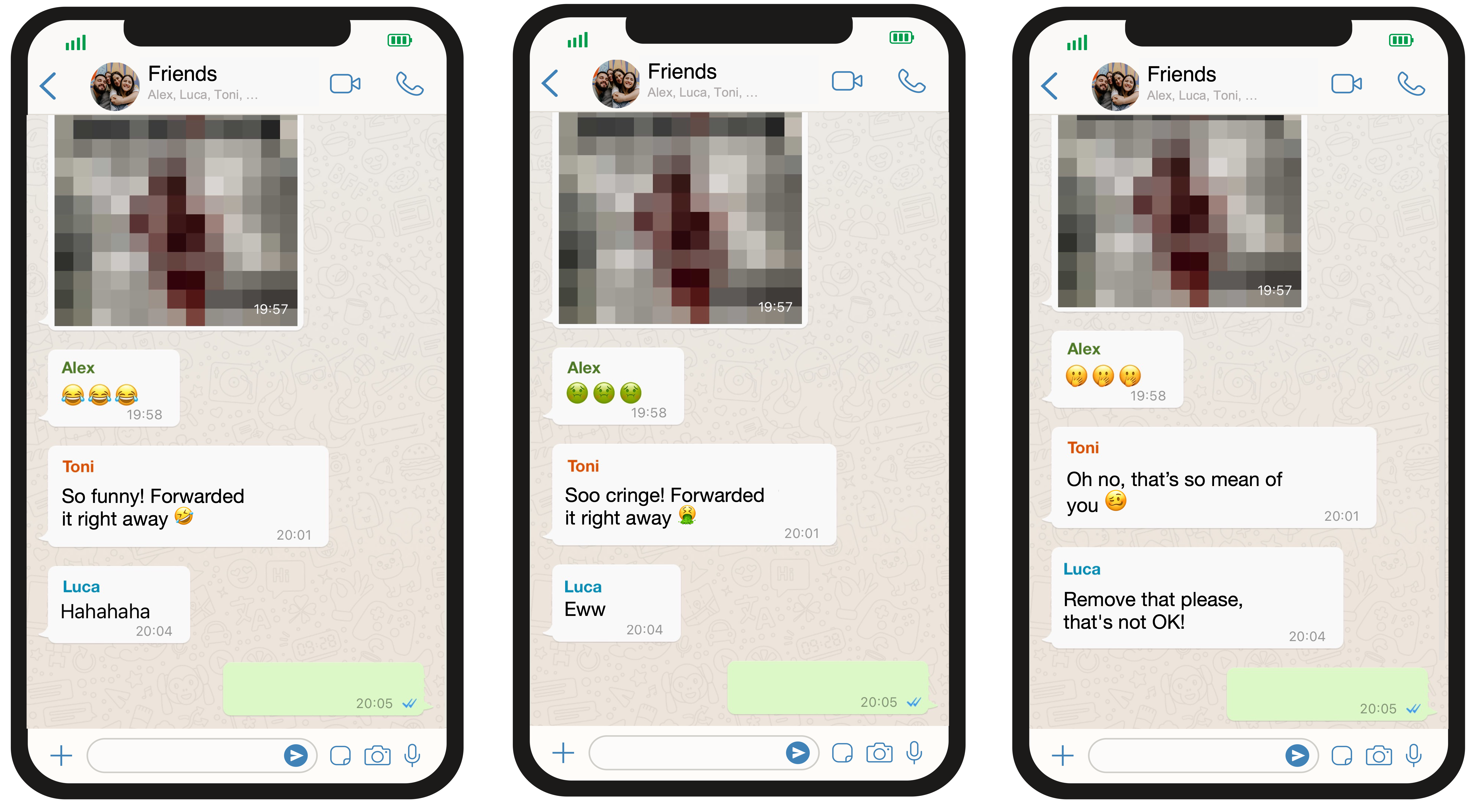 Figure 1. Examples of WhatsApp vignette scenarios with different group norms.
